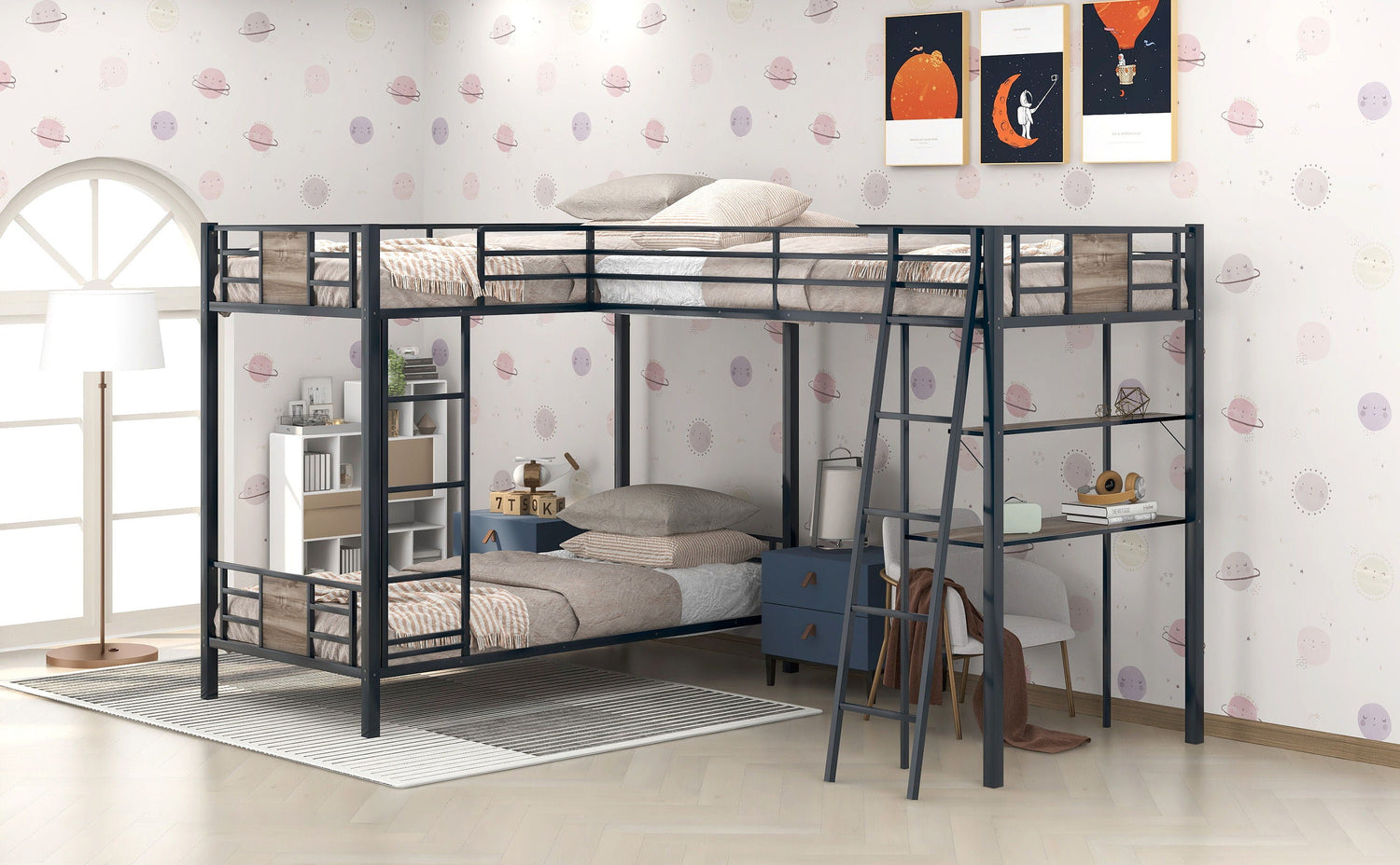 This is a versatile, mission style L-Shaped bed. Constructed of metal and MDF board, these beds are both stylish and durable. These beds are perfect for your family, sleepovers or your extra guest sleeping at your lake house getaway. High-quality, MDF board and sturdy metal, durable frame ensures stability and durability for long-term use. Built-shelved offer convenience for space saving.This L-Shaped Bunk Bed and Loft Bed is designed with a clean silhouette and a hue of elegance. It suits all styles of home decoration, and completes the look of any bedroom.