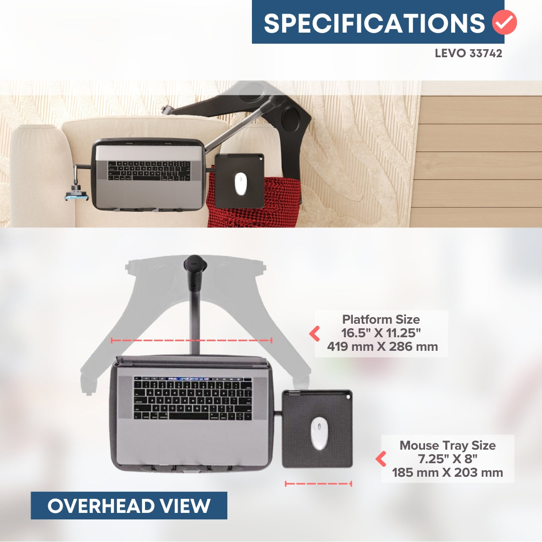 Introducing the LEVO G2 V16 Rolling Laptop Workstation Stand Cart, a versatile and ergonomic solution designed to enhance productivity and comfort in various settings. This innovative stand accommodates laptops up to four pounds and 16 inches wide, providing a stable platform for work or leisure activities. Its adjustable design allows for effortless height and angle customization, ensuring optimal viewing and typing positions whether you're sitting, standing, or reclining. The stand features a sturdy base with smooth-rolling casters, enabling easy mobility across different rooms or workspaces. Additionally, the integrated mouse tray and phone mount offer convenient access to peripherals and devices, streamlining your workflow. Constructed with high-quality materials, the LEVO G2 V16 Rolling Laptop Workstation Stand Cart combines durability with a sleek aesthetic, making it an ideal addition to both home and professional environments.