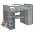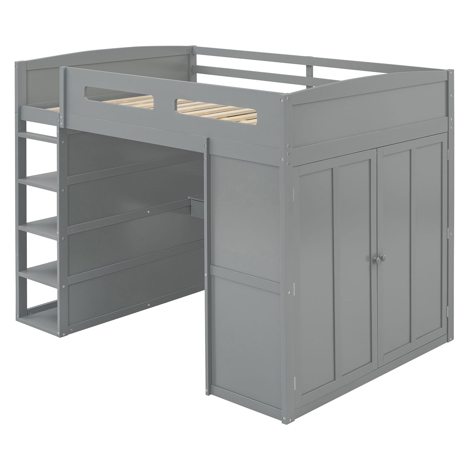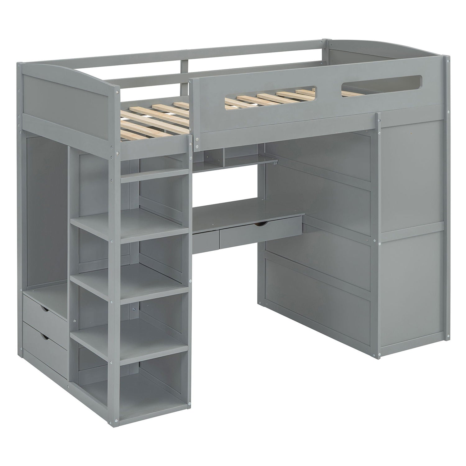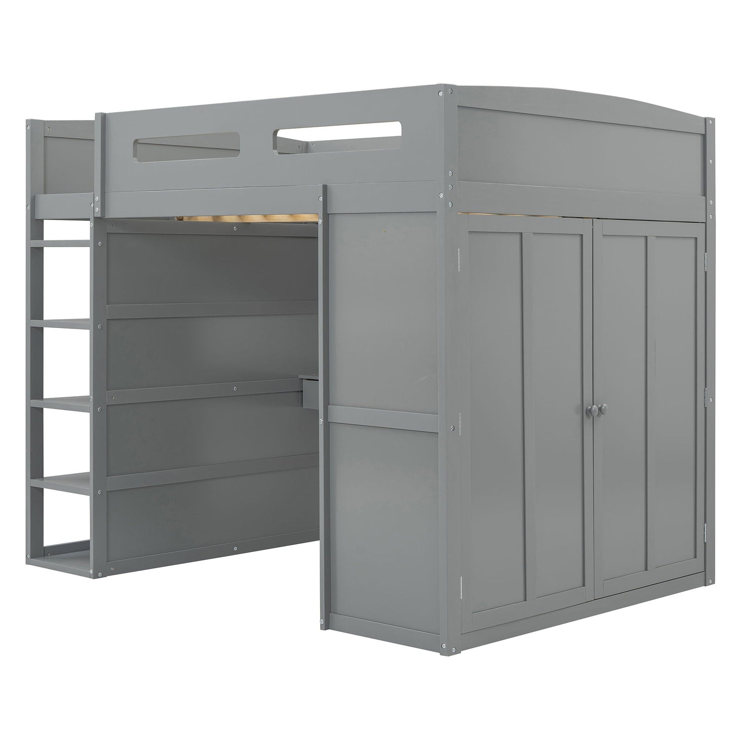Twin Size Loft Bed With Desk, Wardrobes, 4 Drawers And 4 Shelves Construction - Gray