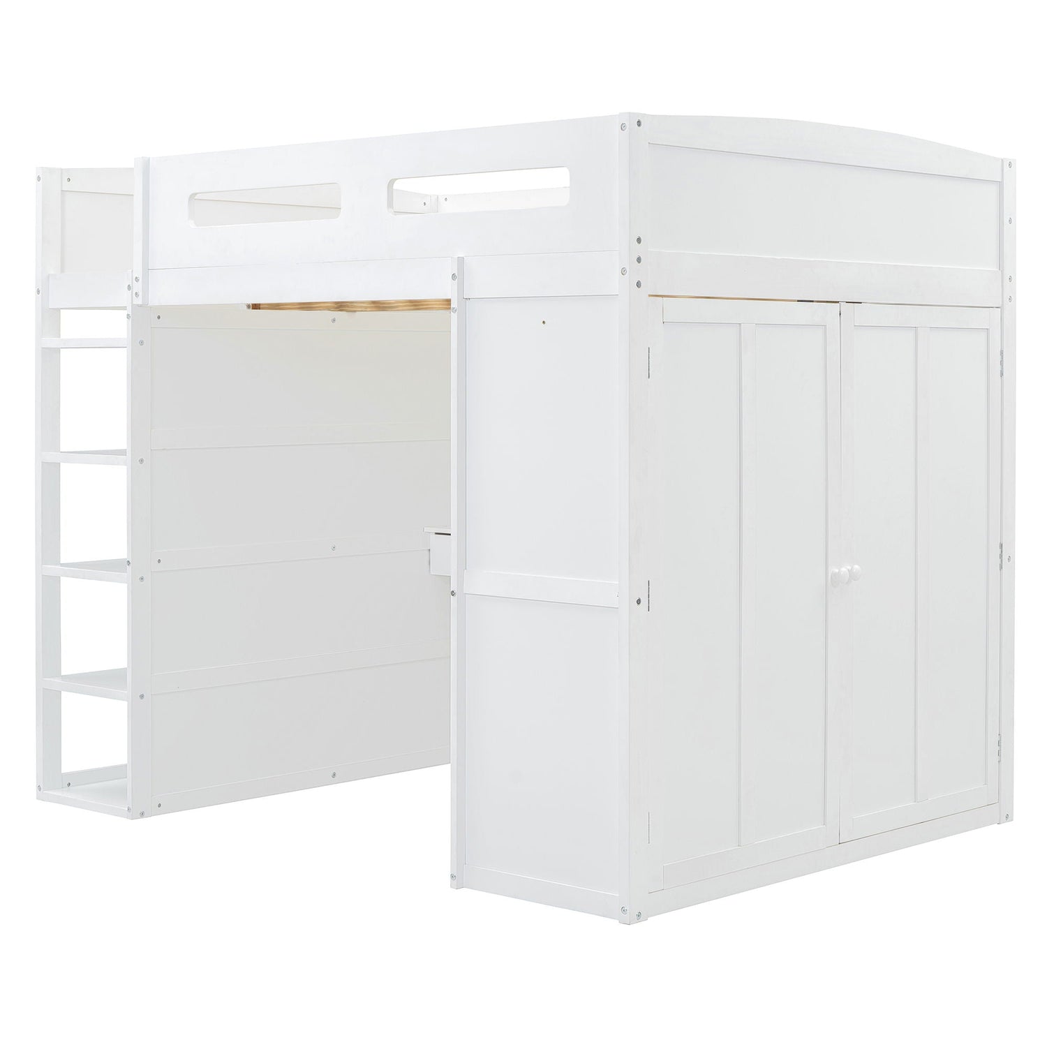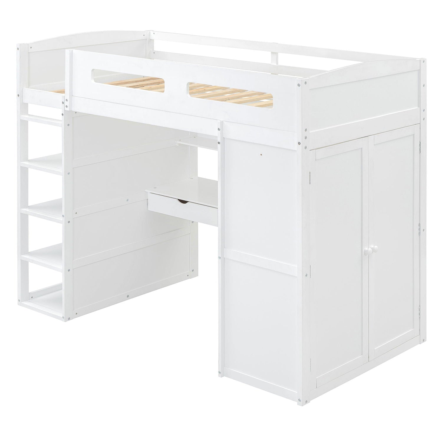 Twin Size Loft Bed With Desk, Wardrobes, 4 Drawers And 4 Shelves - White