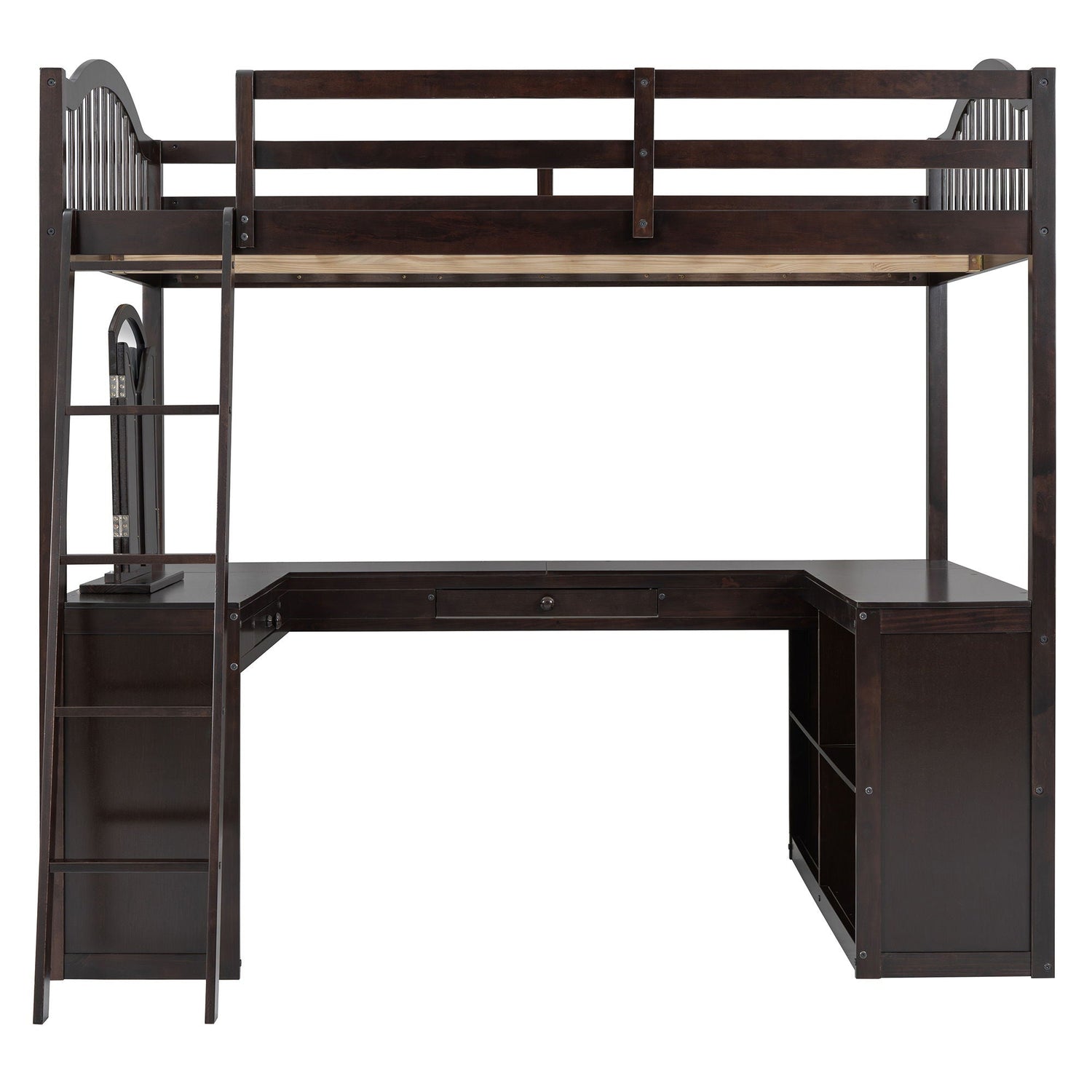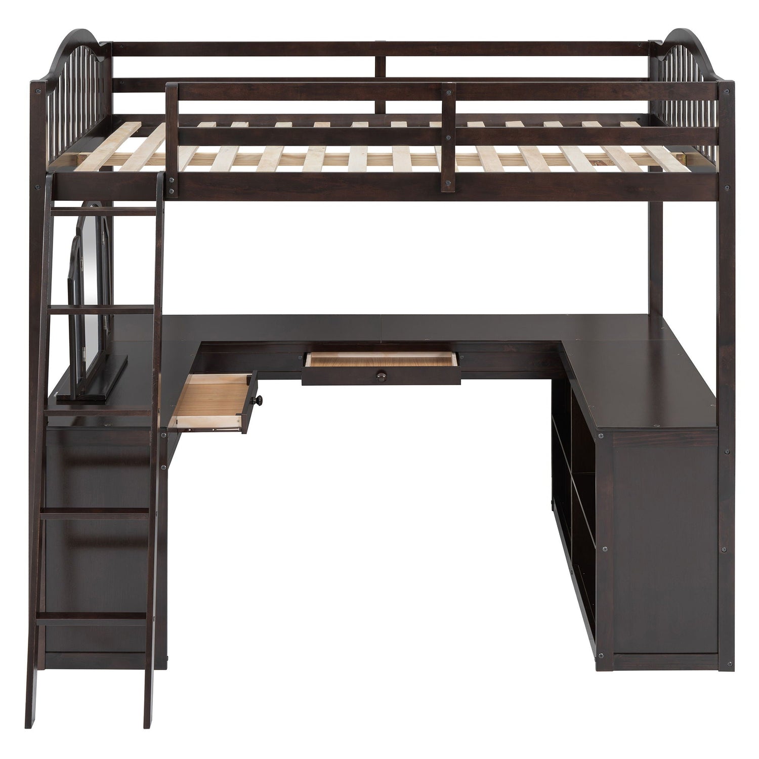 Couch.com Full Loft Bed With U Shaped Desk, Storage Compartments And Tri Fold Mirror Espresso, with Storage, Durable Design, Modern Style, Wood Construction, Dark Brown Finish, Full Size