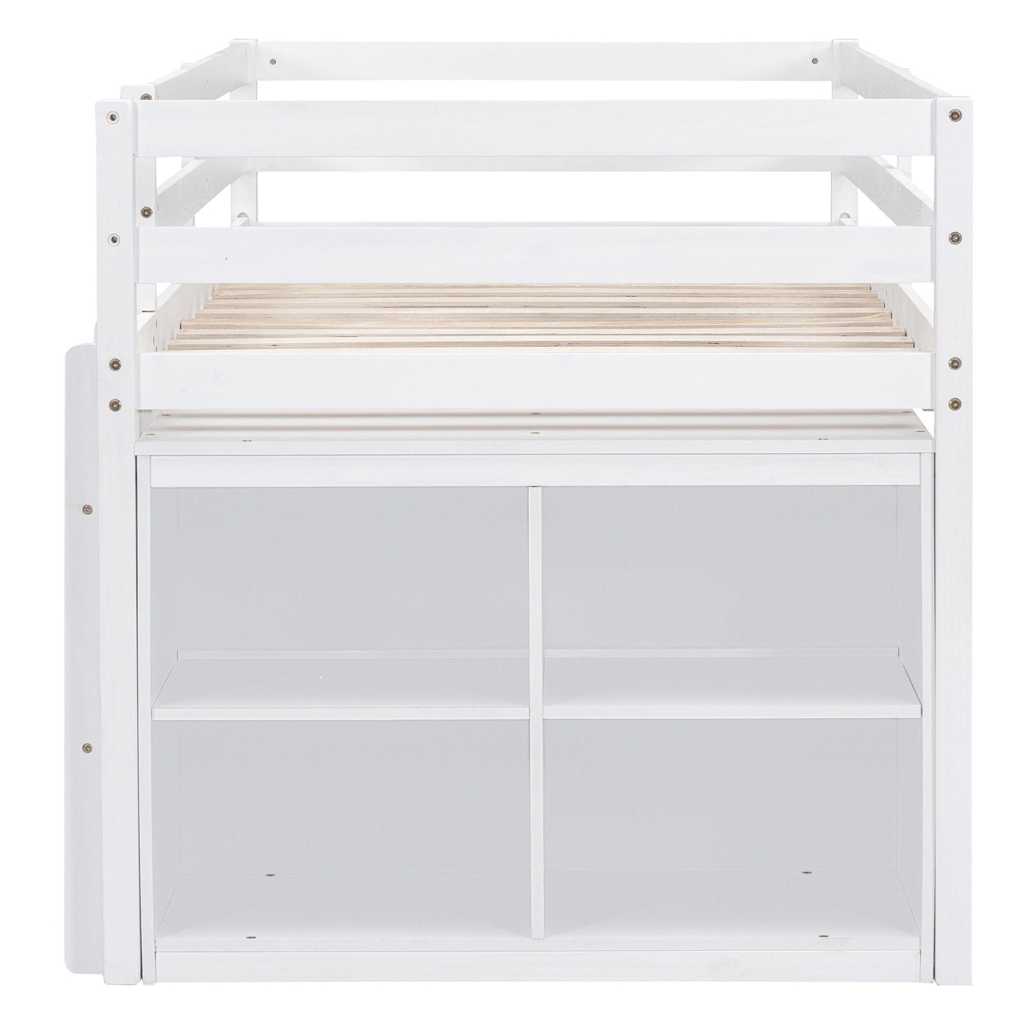 Full Size Loft Bed With Retractable Writing Desk And 4 Drawers, With Lateral Portable Desk And Shelves - White