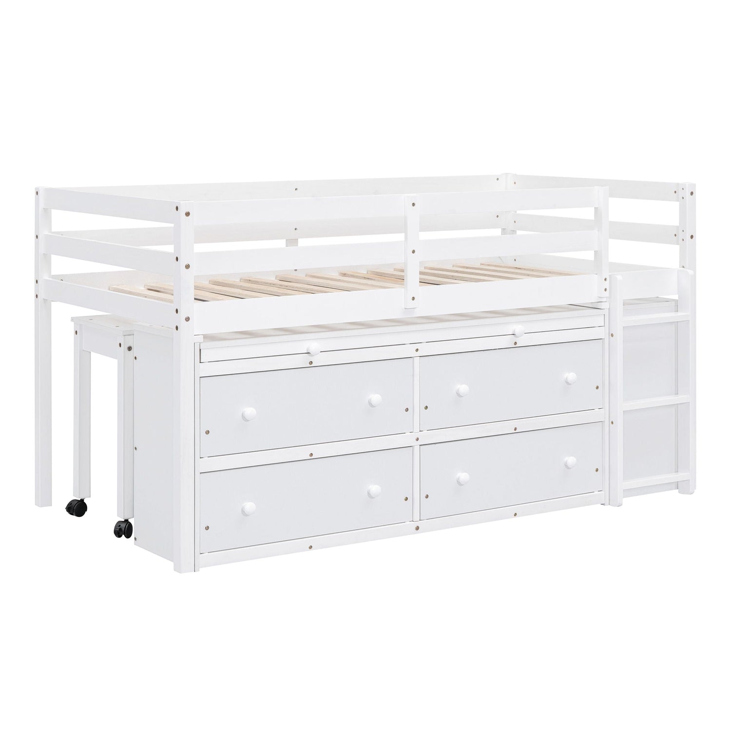 Loft Bed With Retractable Writing Desk And 4 Drawers, With Lateral Portable Desk And Shelves by Couch.com - White / Twin is backordered and will ship as soon as it is back in stock.