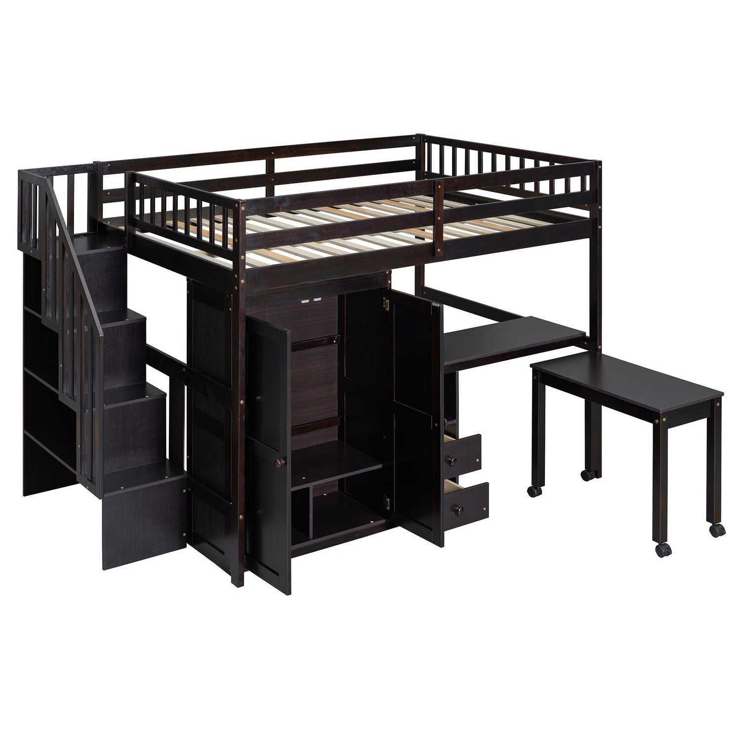 Full Size Loft Bed With Stairs, Bookshelf, Drawers, Desk & Wardrobe, Space Saving Multifunctional Furniture - Espresso