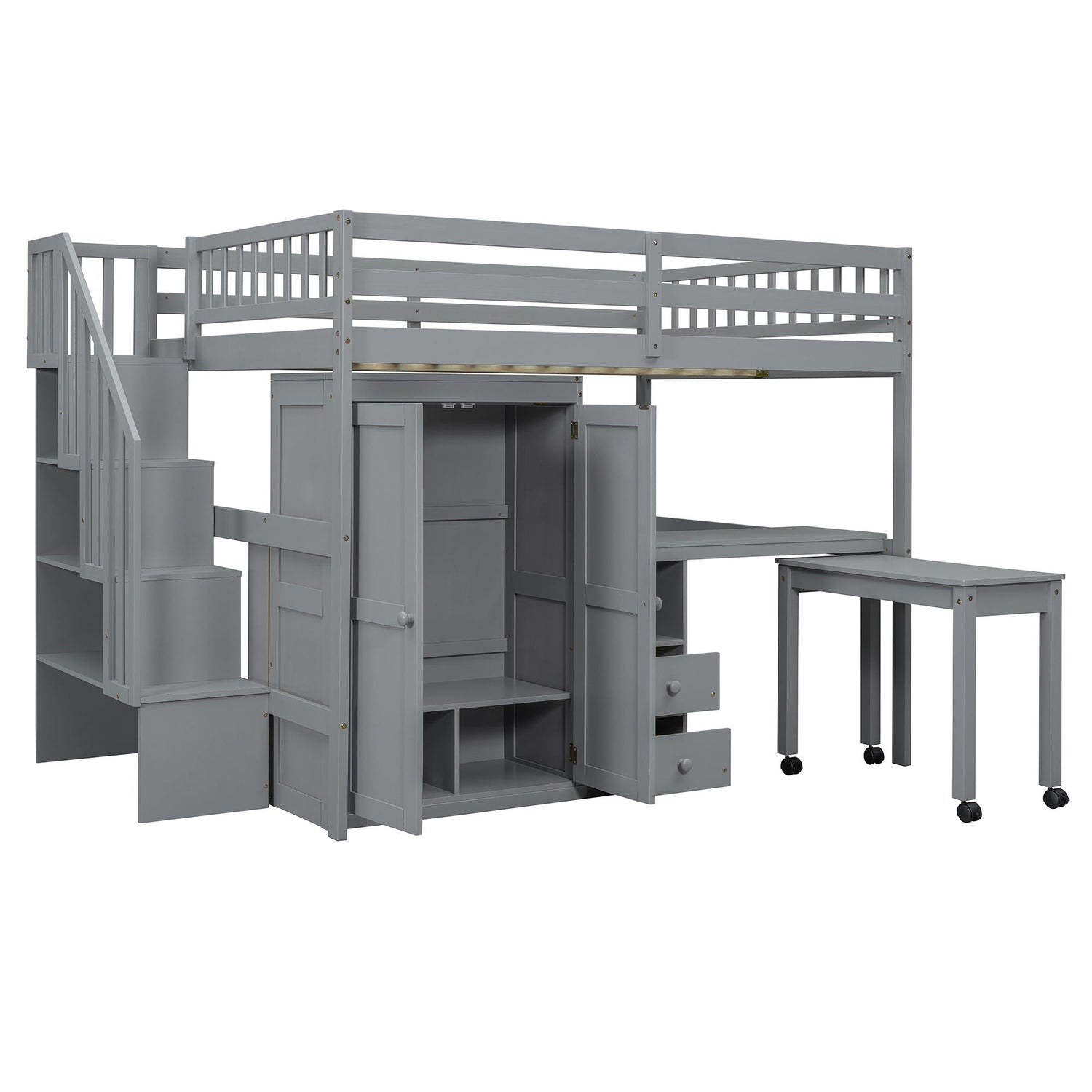 Full Size Loft Bed With Stairs, Bookshelf, Drawers, Desk & Wardrobe, Space Saving Multifunctional Furniture - Gray