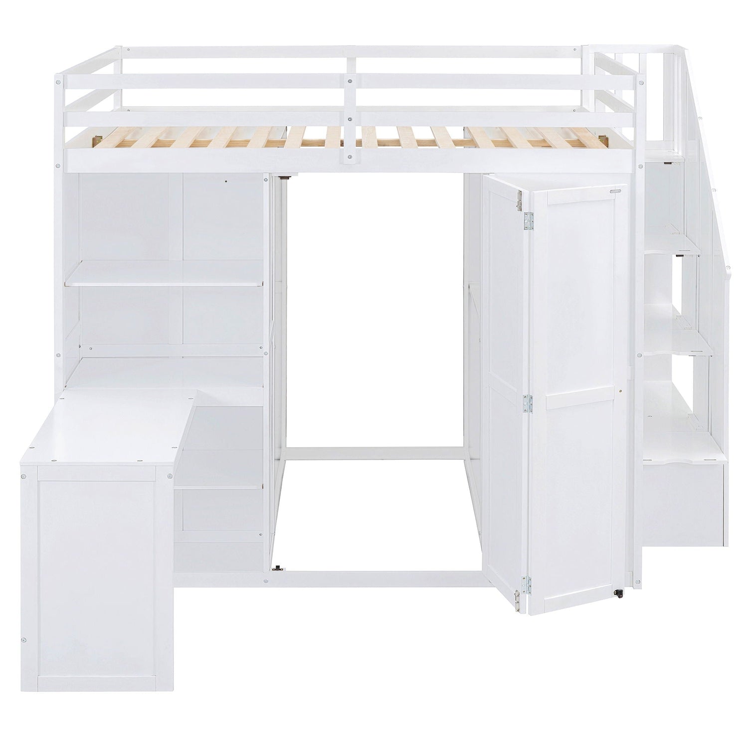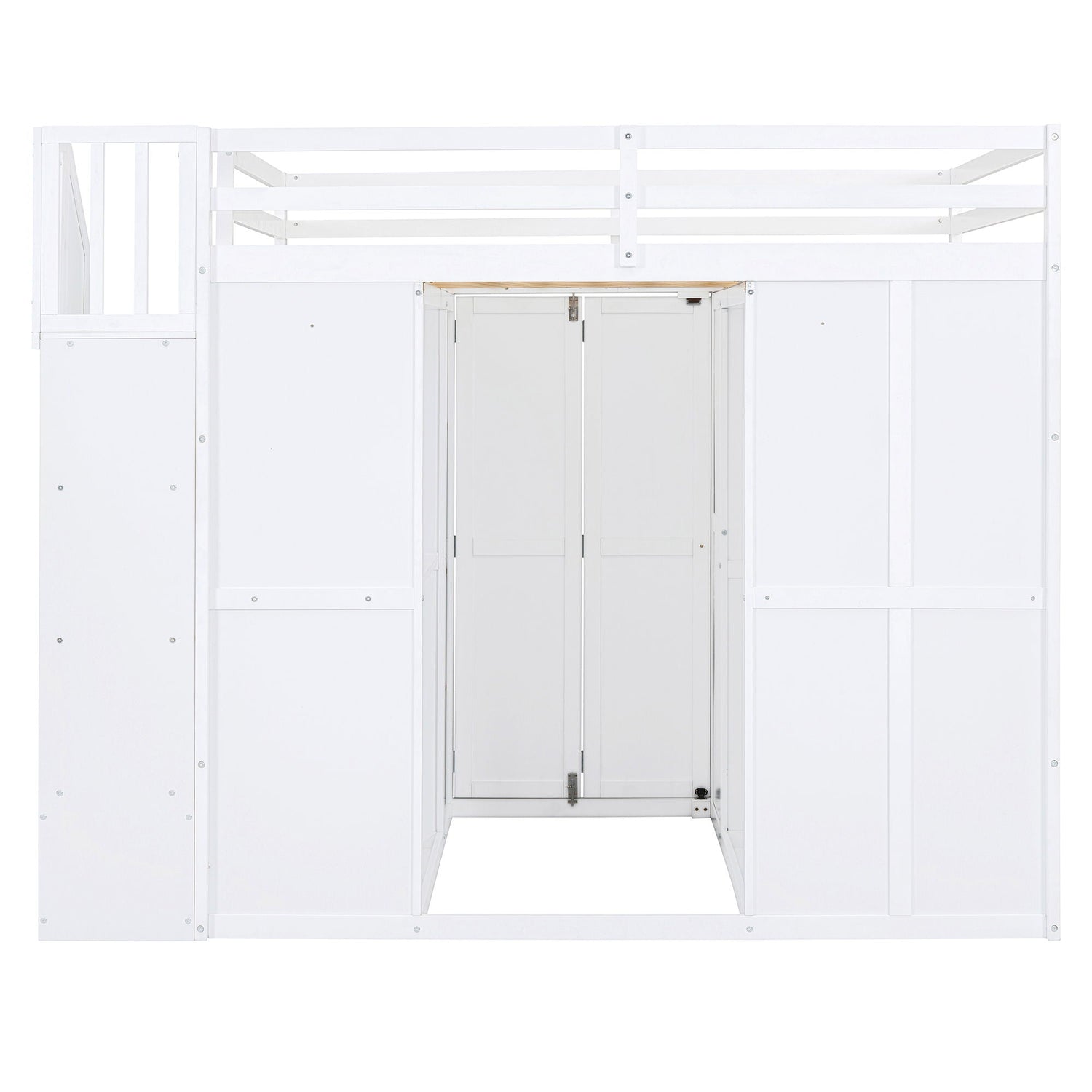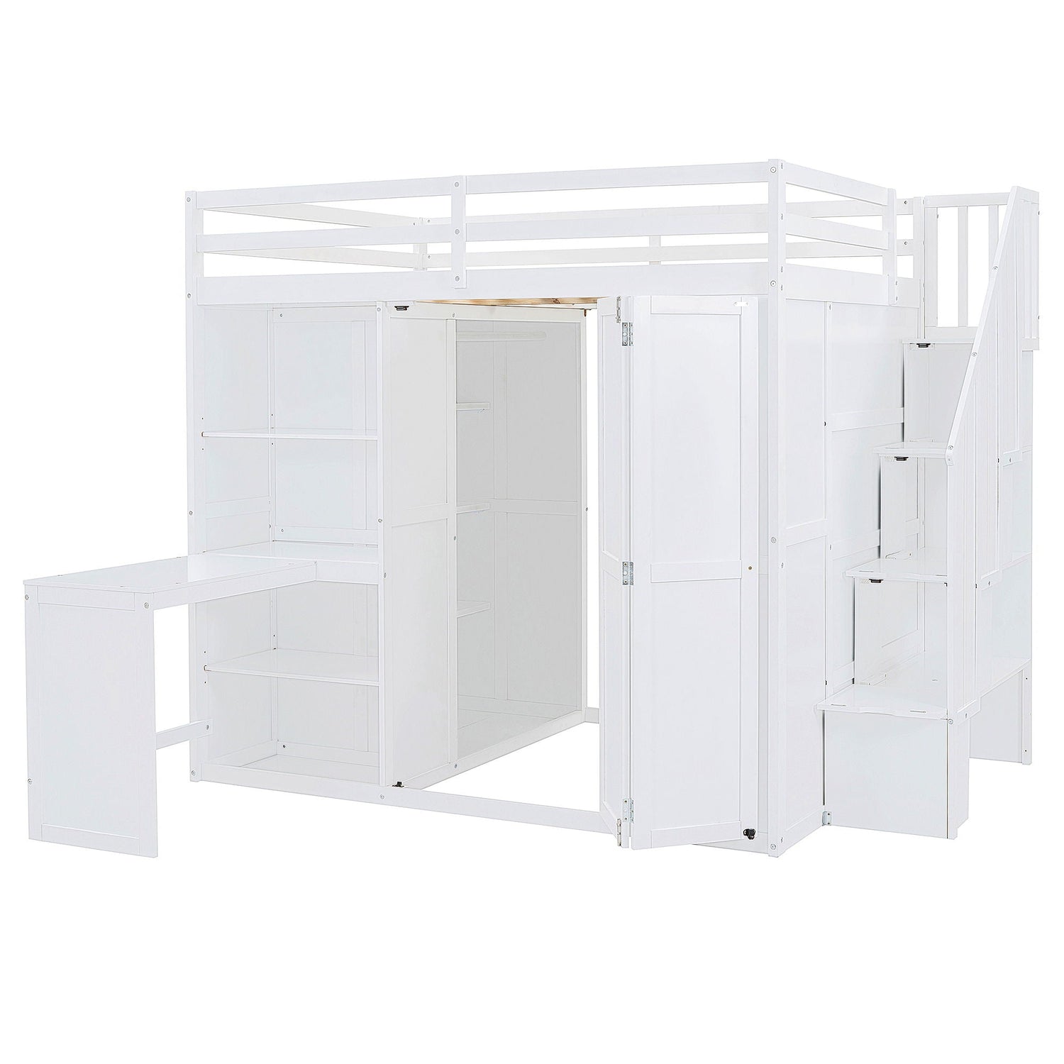 Full Size Loft Bed With Wardrobe, Desk And Shelves - White
