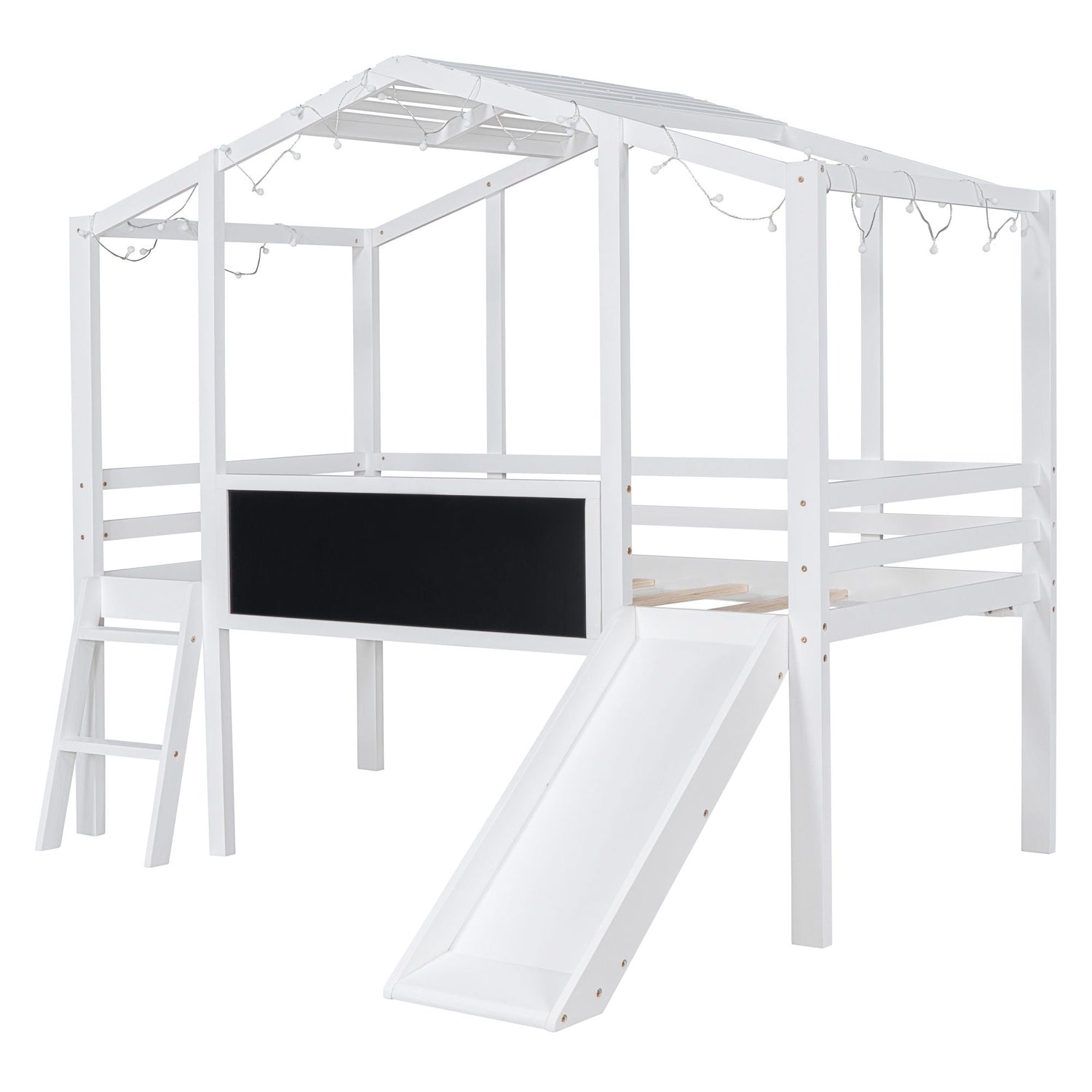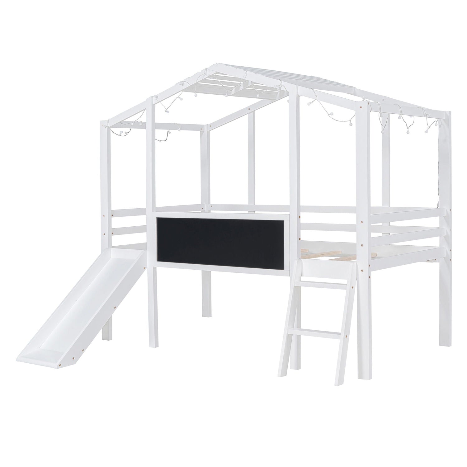 Loft House Bed With Ladder And Slide, With Blackboard And Light Strip On The Roof by Couch.com - White / Twin is backordered and will ship as soon as it is back in stock.