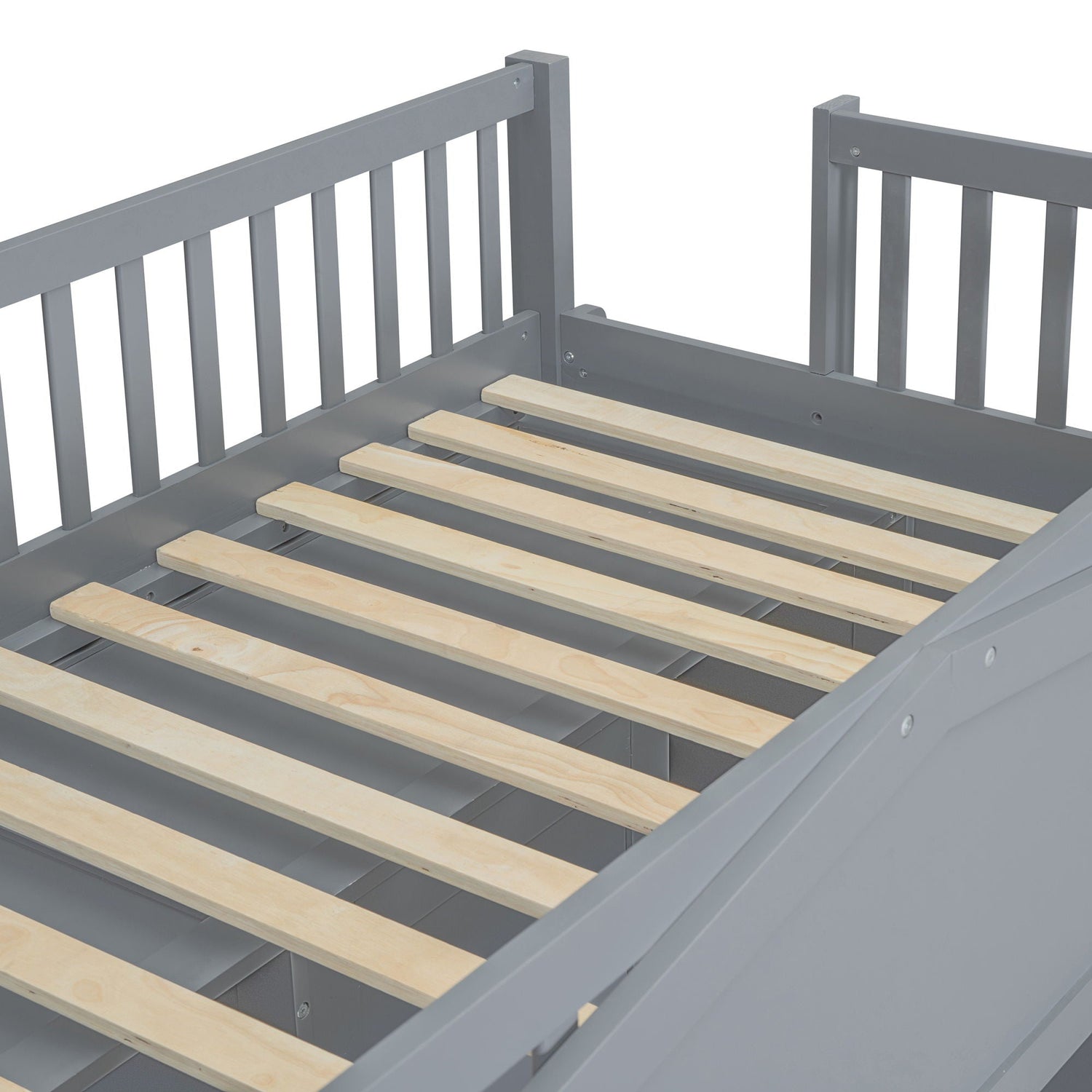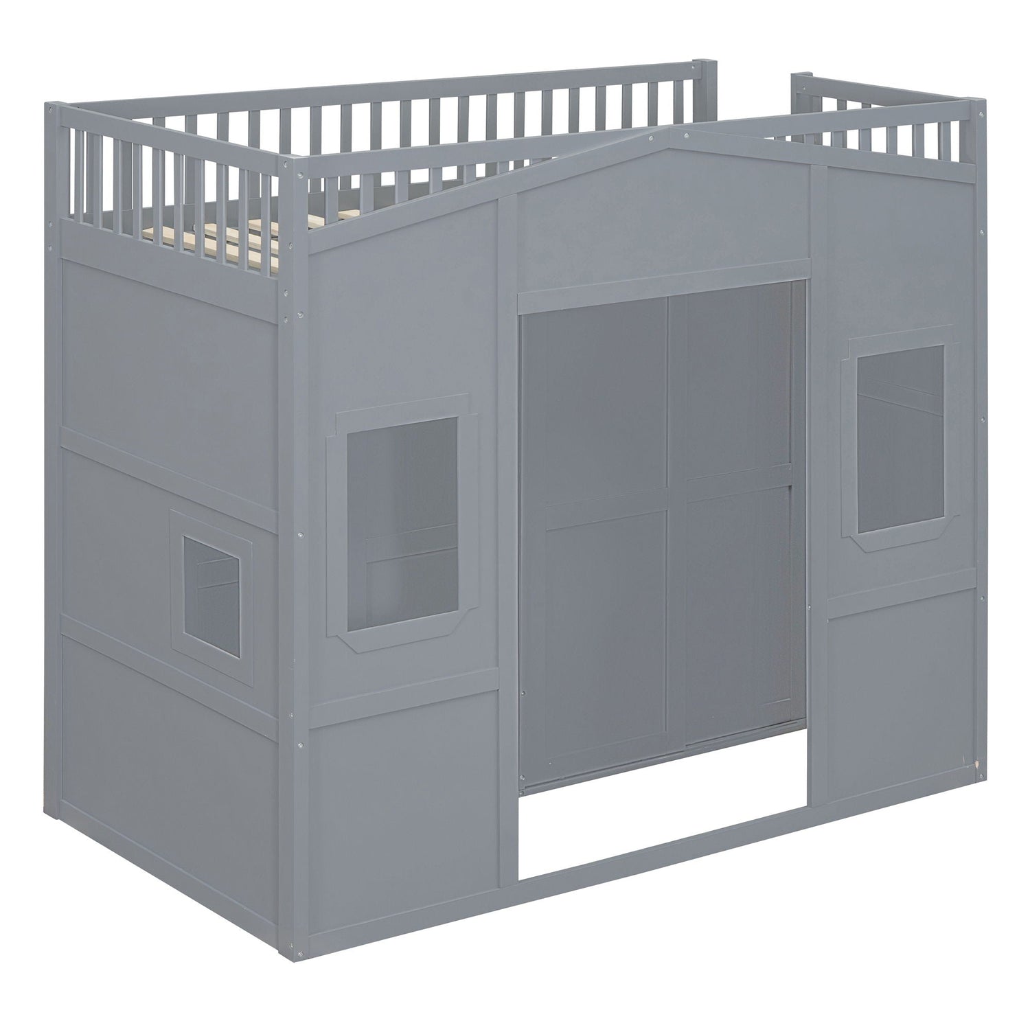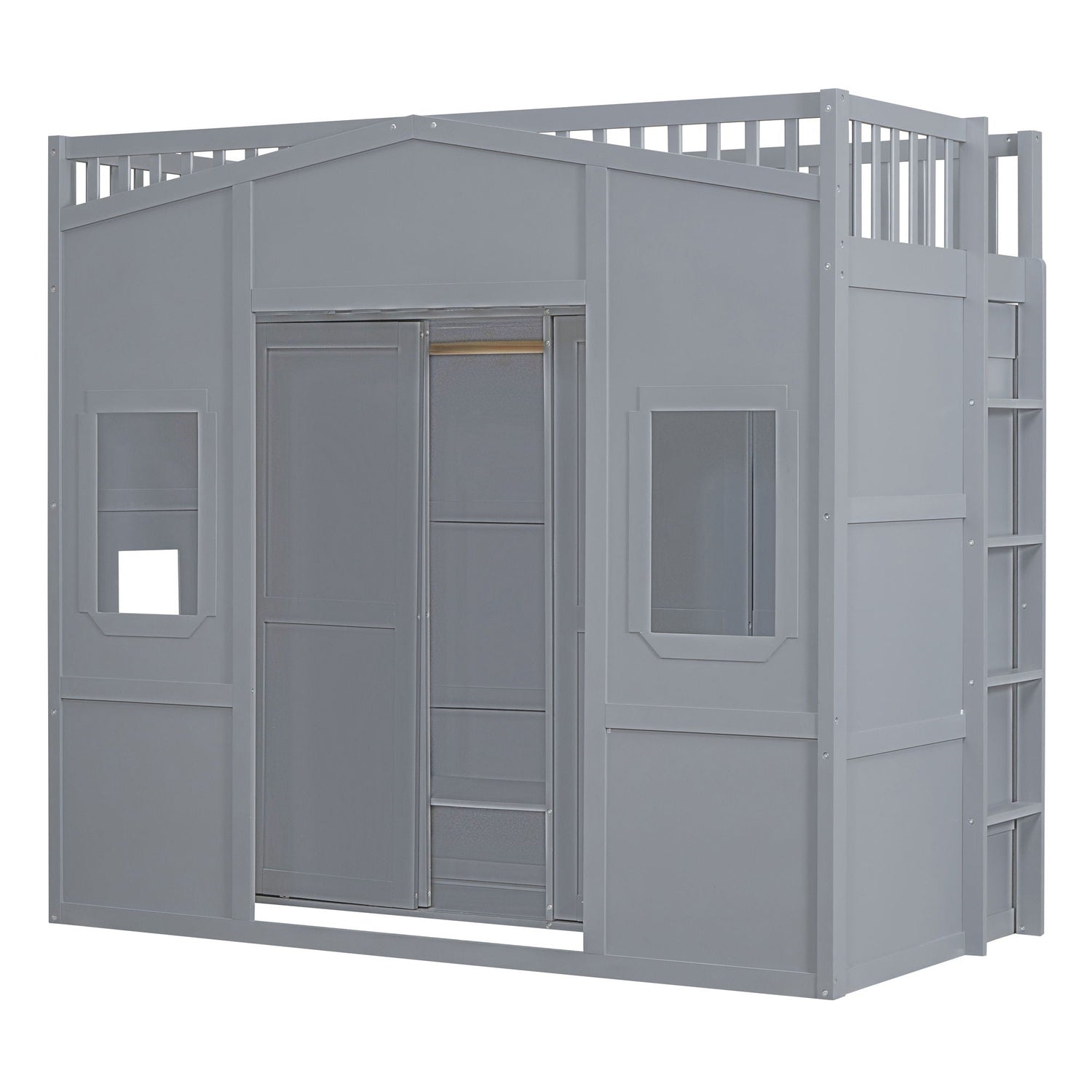 Twin Size House Loft Bed With Ladder And Wardrobe - Gray