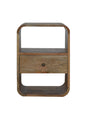 - Features: solid mango wood,oak-ish finish,round edges,1 drawer,brass knob,open slot