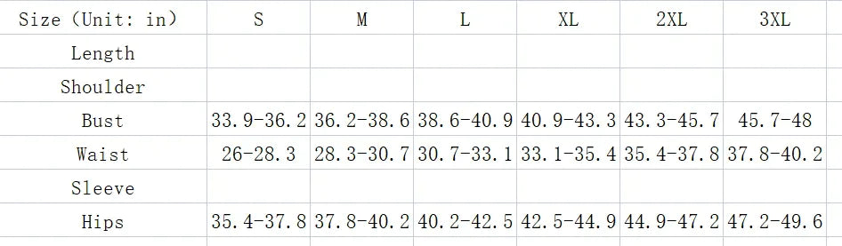 - Size Range: S, M, L, XL, 2XL, 3XL, accommodating various body types.