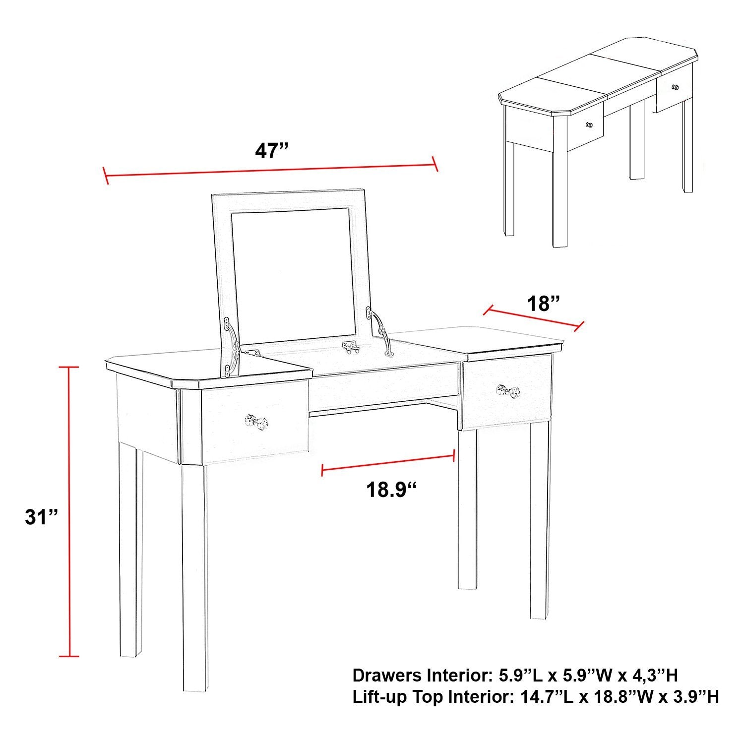 - DIMENSIONS – Vanity: 47"L x 18"W x 31"H; Drawers interior: 5.9"L x 5.9"L x 4.3"H; Lift-Up Top Interior: 14.7"L x 18.8"W x 3.9"H