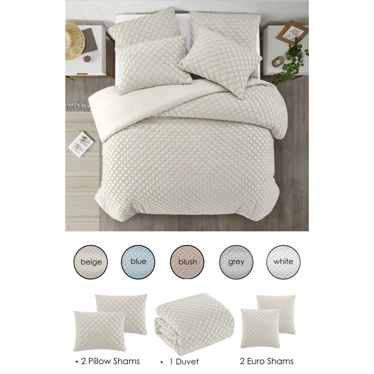 - SIZES - Available in King/California King, Full/Queen, Twin/Twin XL sizes. King/California King and Full/Queen sets include 5 pcs: 2 Pillow Shams, 2 Euro Shams, 1 Duvet Cover. Twin/Twin XL include 3 pcs: 1 Pillow Sham, 1 Euro Sham, 1 Duvet Cover.