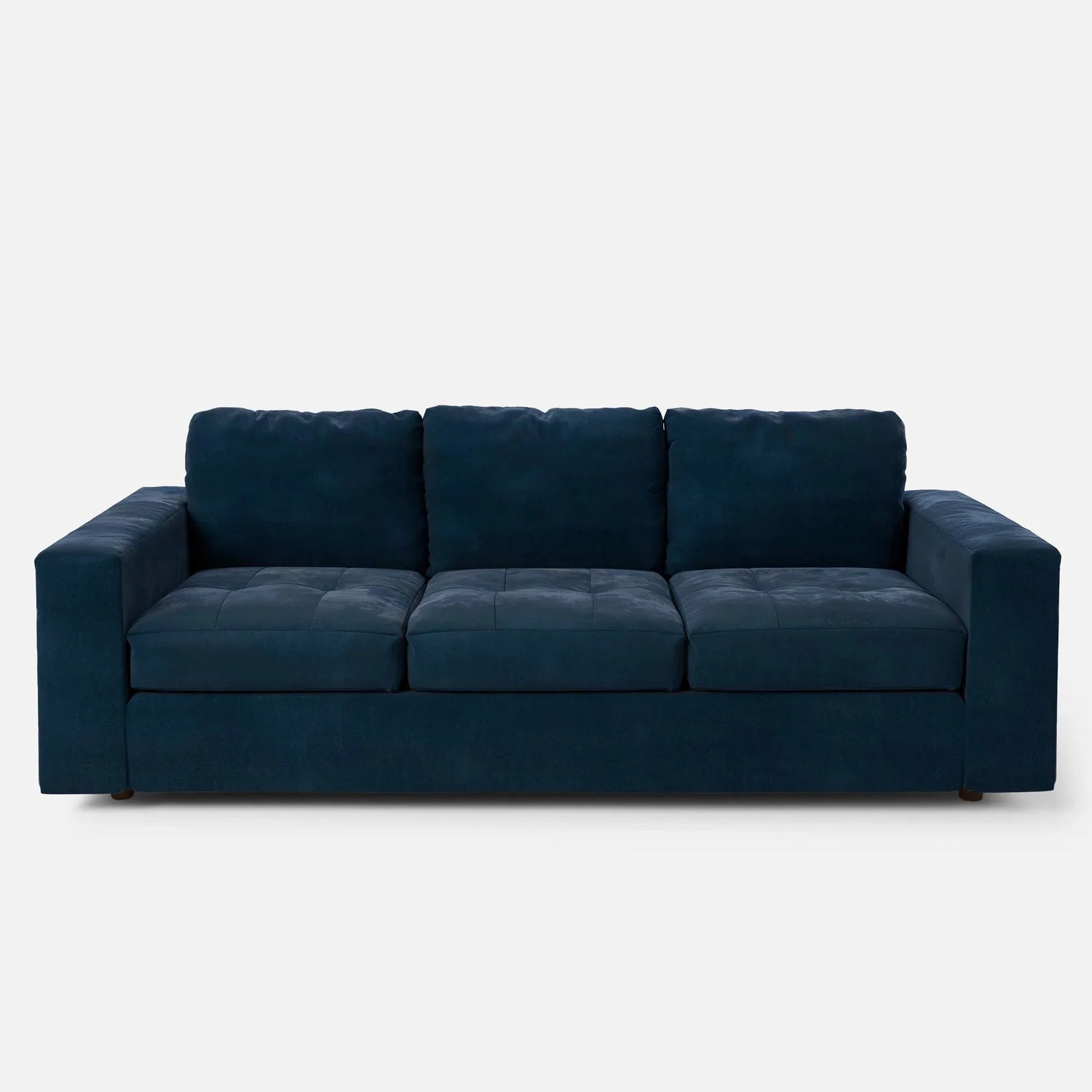 Choose from three stylish fabrics: rich Juniper Velvet, timeless Navy Velvet (both 74% cotton, 26% polyester, Wyzenbeck 100,000), or the unique Cream Corduroy (100% polyester, Wyzenbeck 100,000). Each fabric is carefully selected for a luxurious feel and durability. The Marc Tufted Sofa is proudly made in California, ensuring quality craftsmanship.