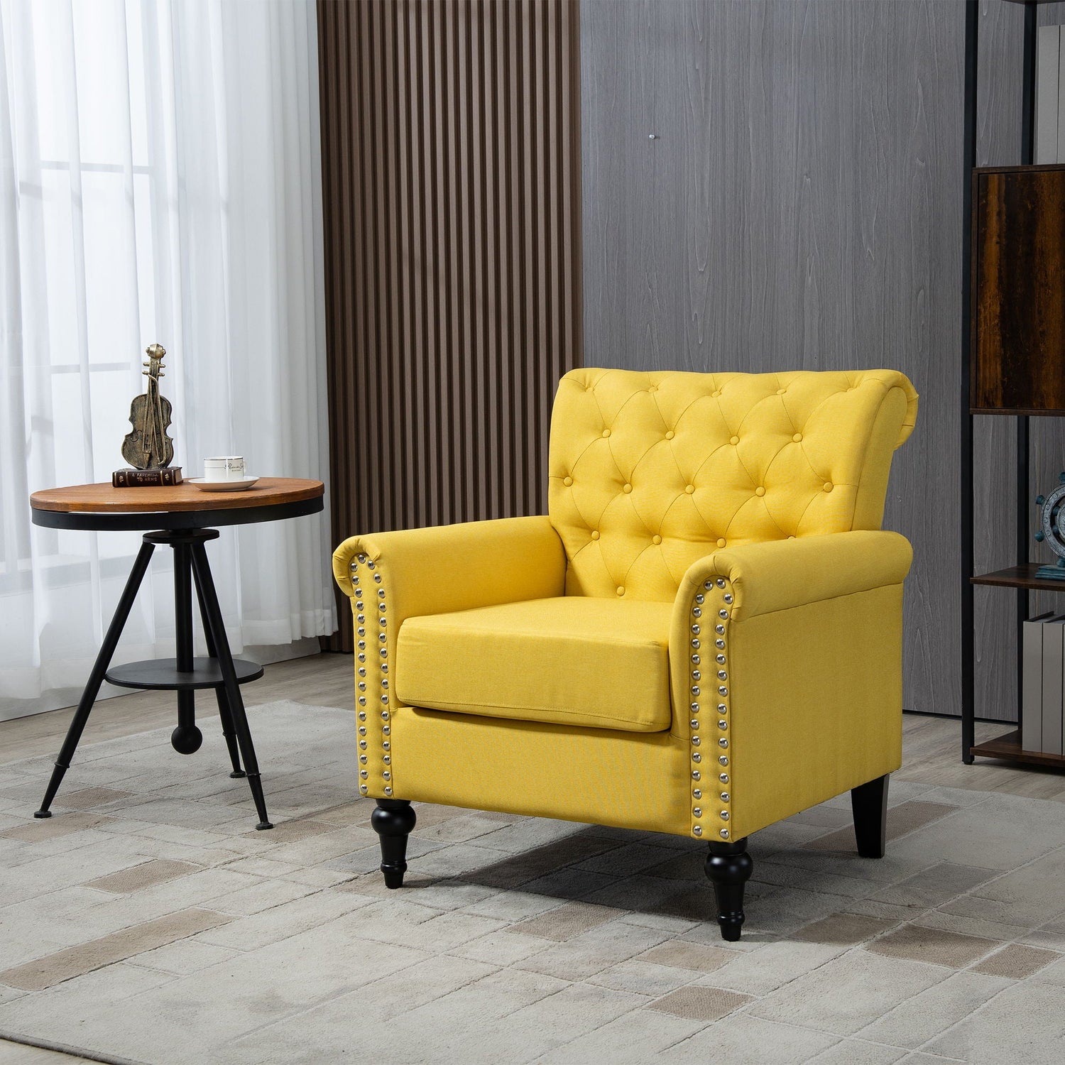 Mid-Century Modern Accent Chair, Linen Armchair With Tufted Back / Wood Legs, Upholstered Lounge Arm Chair Single Sofa For Living Room Bedroom - Yellow