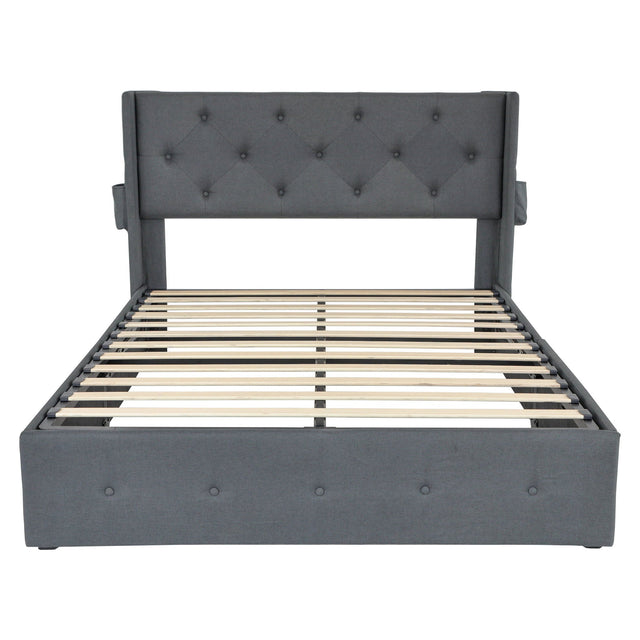 Modern Queen Size Bed Frame With Storage, Wingback Headboard, USB Ports - Dark Gray