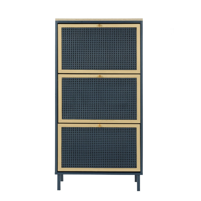 3 Door Metal Shoe Rack, Freestanding Modern Shoe Storage Cabinet With Metal Rattan, Particle Board For Entryway - Blue Gray