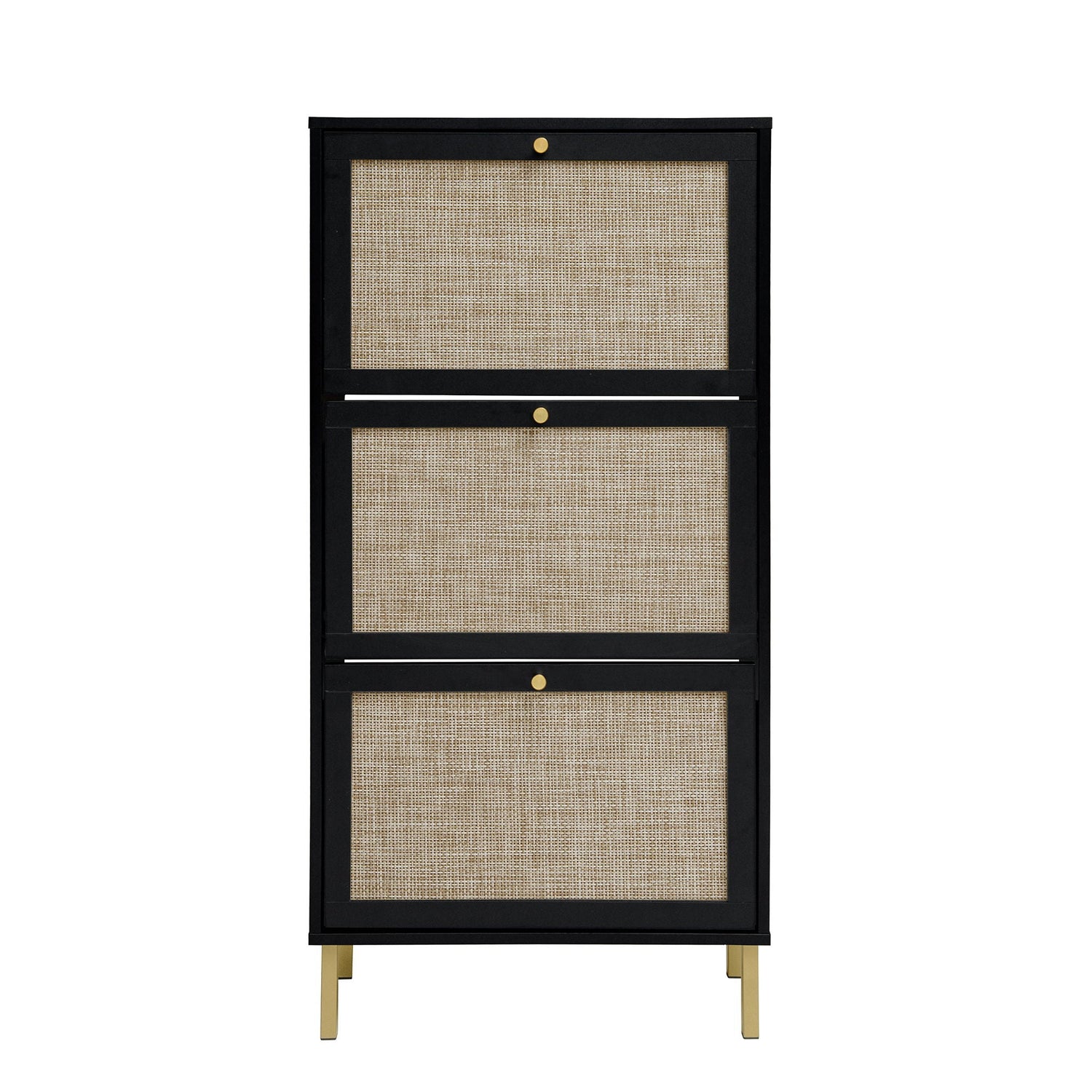 Modern Rattan 3 Door Shoe Rack Cabinet For Entryway Freestanding Black Storage Unit In Particle Board - Black