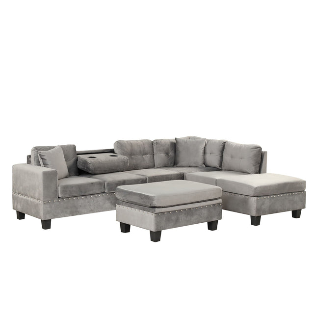 Modern Sectional Sofa With Storage Ottoman, L-Shape Couch With 2 Pillows And Cup Holder, Sectional Sofa With Reversible Chaise For Living Room - Gray