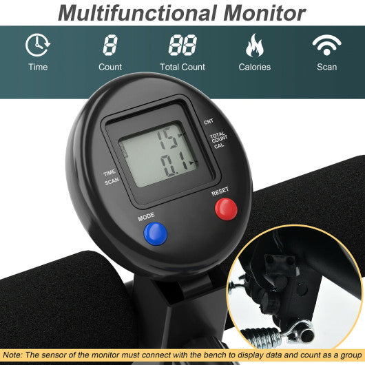 —� Multifunctional Monitor: Different from another traditional weight bench this sit-up bench is equipped with a clear monitor that feeds back the data you need in real-time such as time count total count and calories. In addition the multifunctional monitor is easy to operate.