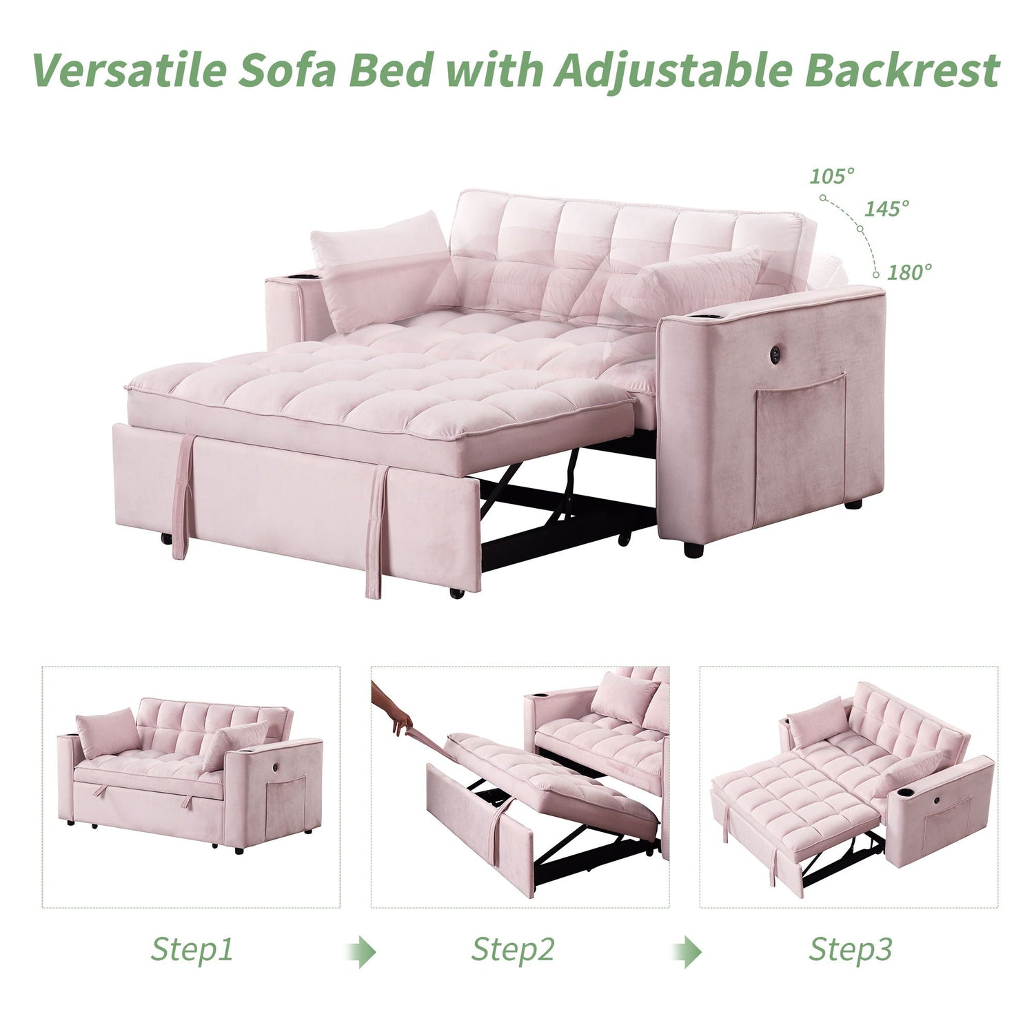 Multi Functional Sofa Bed With Cup Holder And USB Port For Living Room Or Apartments - Pink