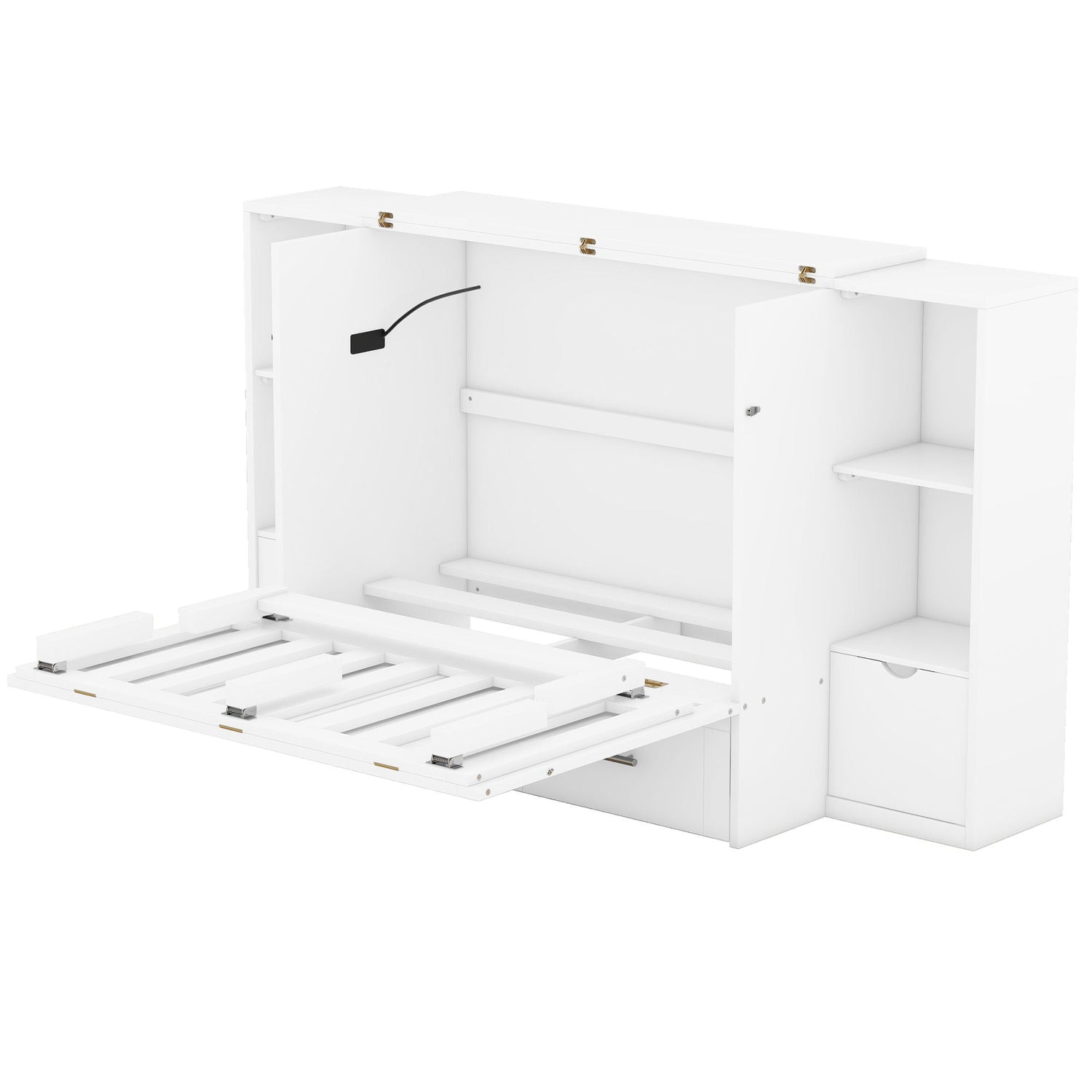 Full Size Murphy Bed With Shelves, Drawers And USB Ports - White