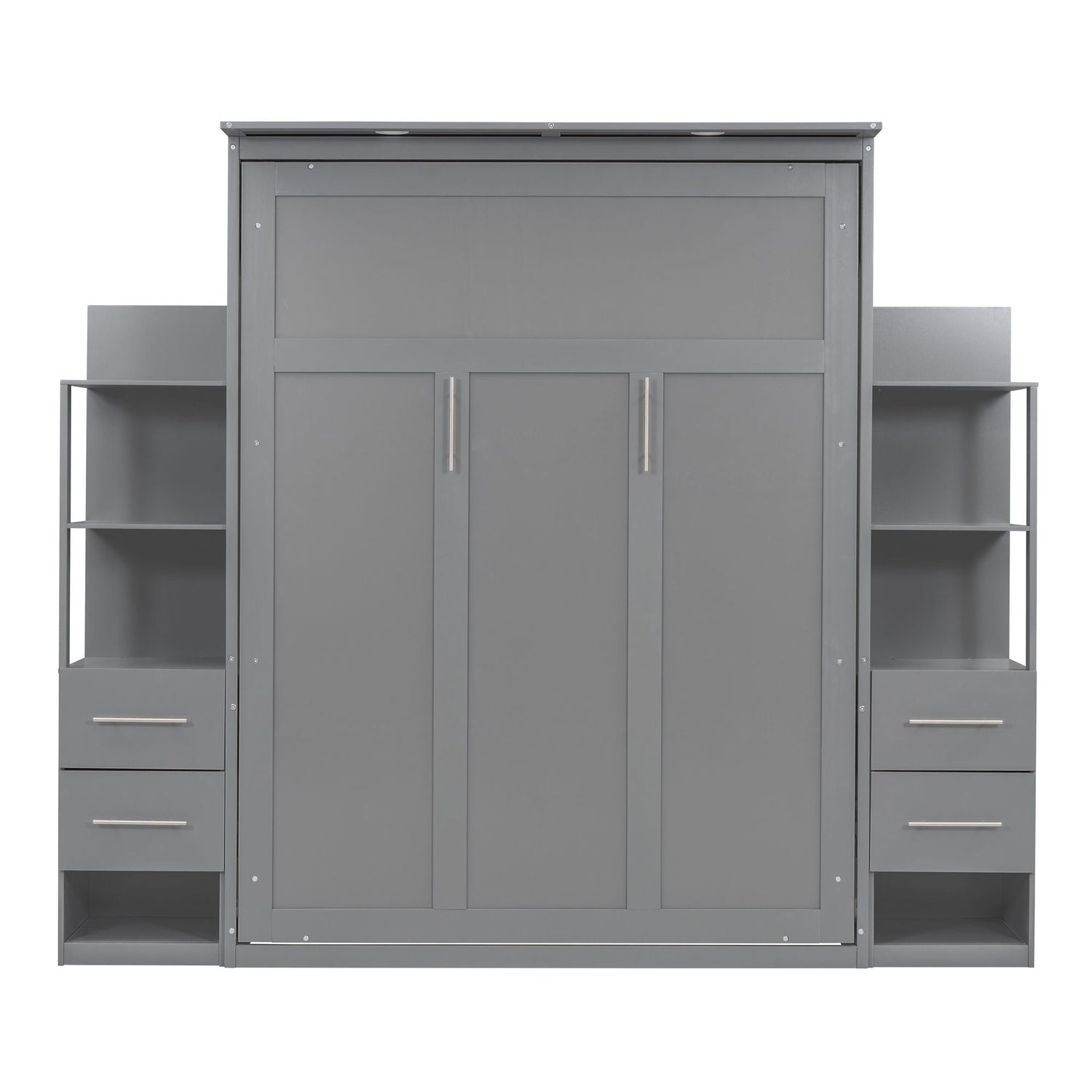 Queen Size Murphy Wall Bed With Shelves, Drawers And LED Lights - Gray