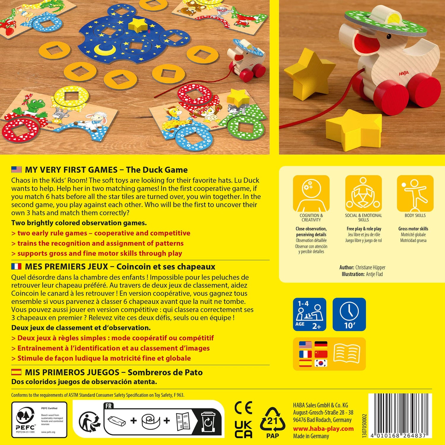 Children can choose to play two brightly colored observation games and help the little ducky while they play. In the first cooperative game, children win together if they can match the six hats before all of the star tiles are turned over. In the second game, children play against each other to determine who will be the first to uncover their own three hats and match them correctly.