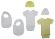 Short Sleeve Onezie Bodysuits (100% Cotton), Yellow Short Sleeve One Piece (100% Cotton), Yellow Baby Cap (100% Cotton), White Baby Cap (100% Cotton), White Terry Bib with White Trim (80% Cotton / 20% Polyester Terry), White Terry Bib with White Trim (80% Cotton / 20% Polyester Terry)