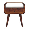 • Newton Nightstand - With its elegant curves and timeless craftsmanship, this nightstand is handcrafted from 100% Solid Mango Wood in a rich finish. Designed for both style and functionality, it features a single drawer with a royal brass knob for discreet storage and an open shelf for easy access to books or essentials. Resting on sleek, tapered legs, this piece brings a refined mid-century charm to any bedroom or living space. Durable, sustainable, and effortlessly stylish, it seamlessly blends practicality with artisanal beauty, making it a standout addition to your home.