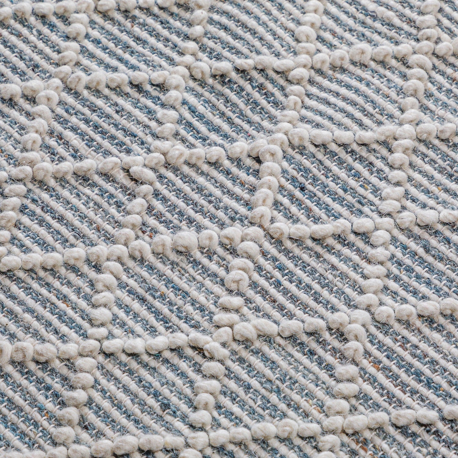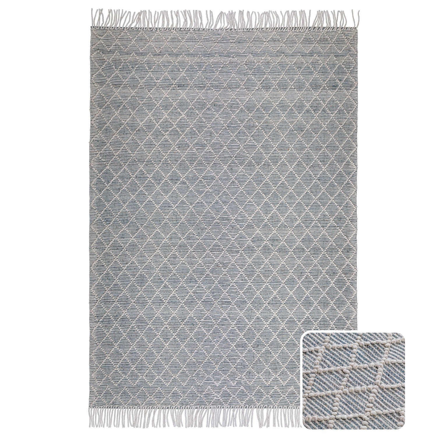 - Detailed with a diamond pattern invory and teal featuring a hand-knotted fringe