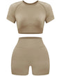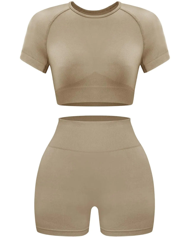 OLCHEE Womens Workout Sets 2 Piece - Seamless Acid Wash Yoga Outfits Shorts and Crop Top Matching Gym Athletic Clothing Set Short-sleeve + Shorts: Coffee Small