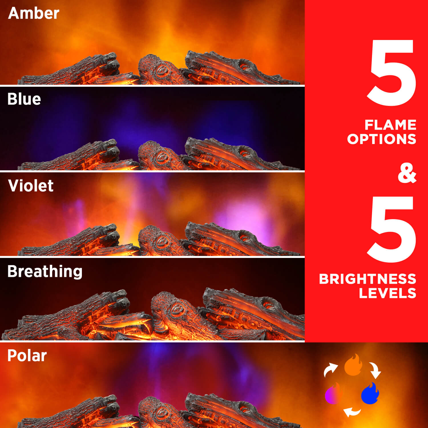 Unlike other simple electric log sets, the EF26-LG provides 5 flame options and 5 brightness levels to fit any occasion. The unique 'breathing' mode gently lights the ember bed without a bright, flickering flame that can disturb your sleep.