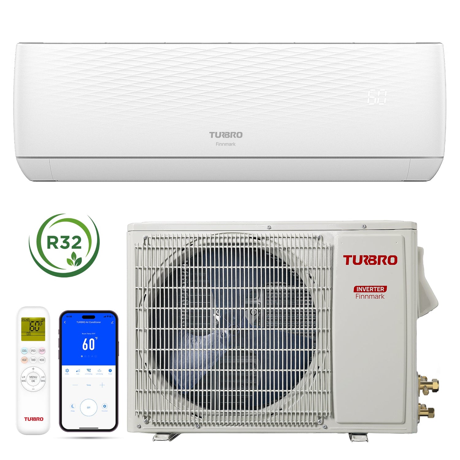 The TURBRO Finnmark mini split unit AC provides powerful, efficient, and comfortable cooling and heating all year round! With super strong inverter technology, this air conditioner can cool in extreme outdoor temps up to 131°F and heat at -13°F. The turbo function provides quick cooling and heating, while the SEER2 rating of 19 (DOE New Efficiency Standard of 2023) can lower electricity bills. Enjoy comfortable cooling and heating with easy installation with labeled wiring, an installation positioning board, and an indoor unit support bracket. Control the temperature with a mobile phone app, Alexa, Google Assistant, or the included remote control.