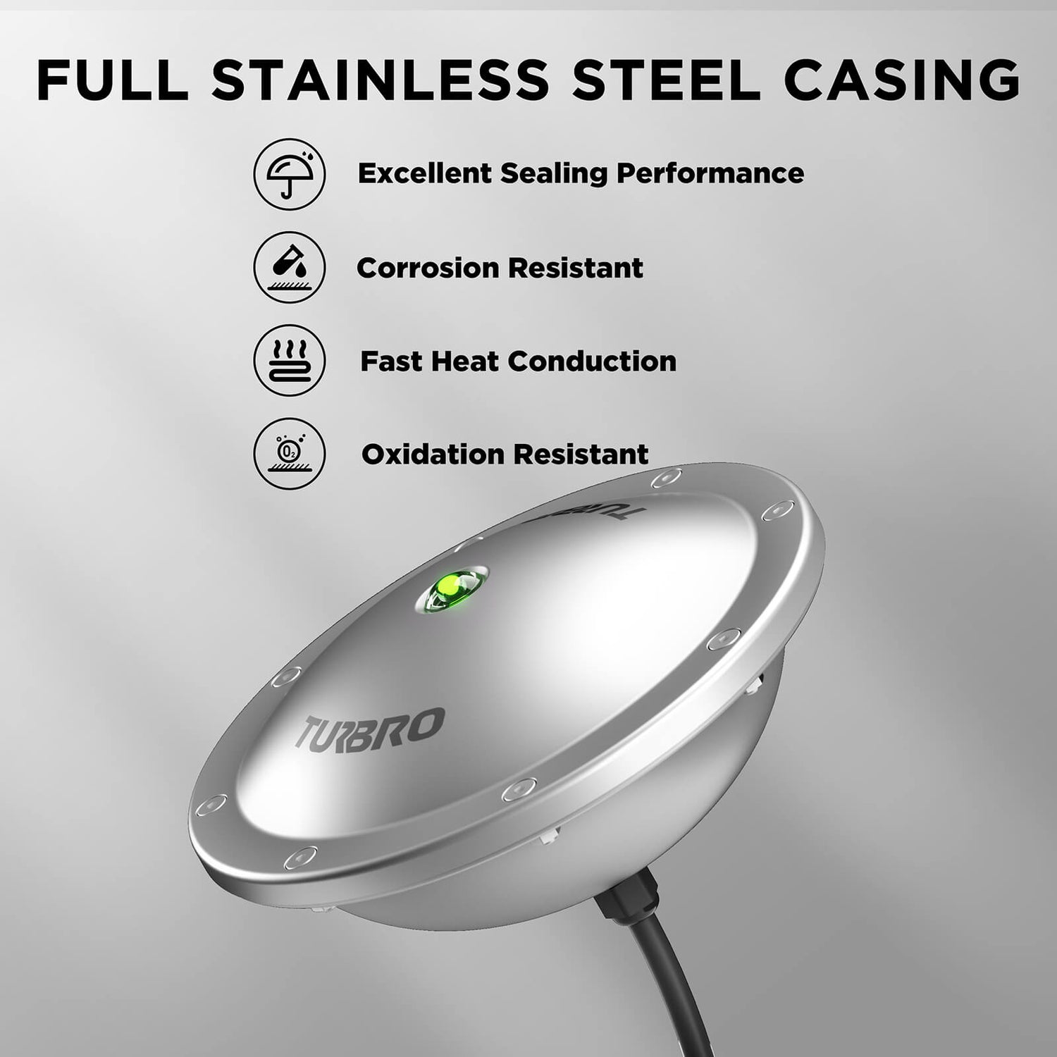 - 🐟Extended Power Cord: With a generous 32.8ft power cord, TURBRO pond de-icer ensures flexibility in its placement, reaching further to meet your specific needs.