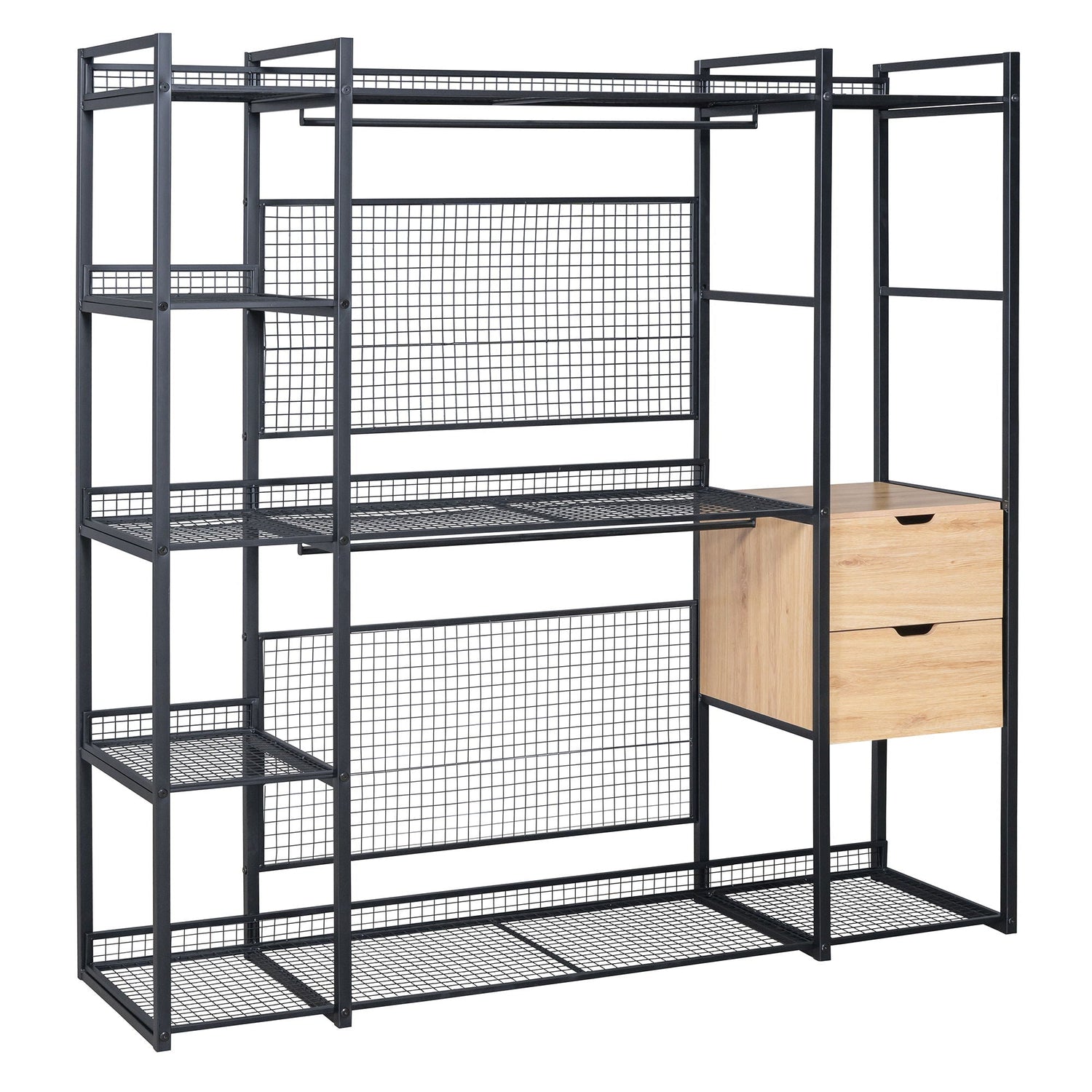 Maximized Space: The open-style clothing rack maximizes closet space with its hanging rails and metal shelves, offering ample room for clothing and accessories.