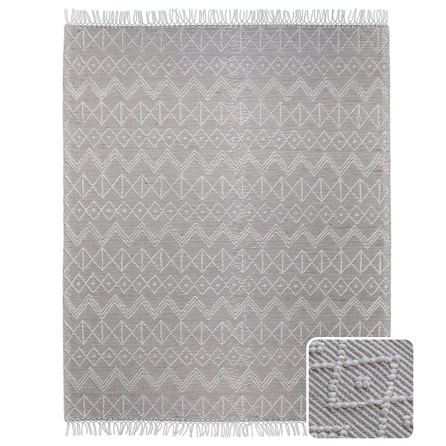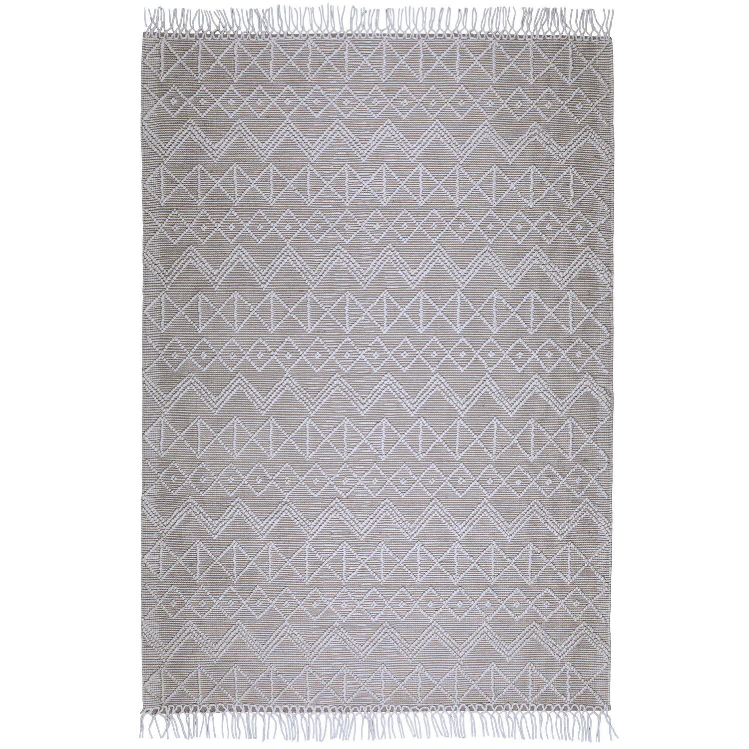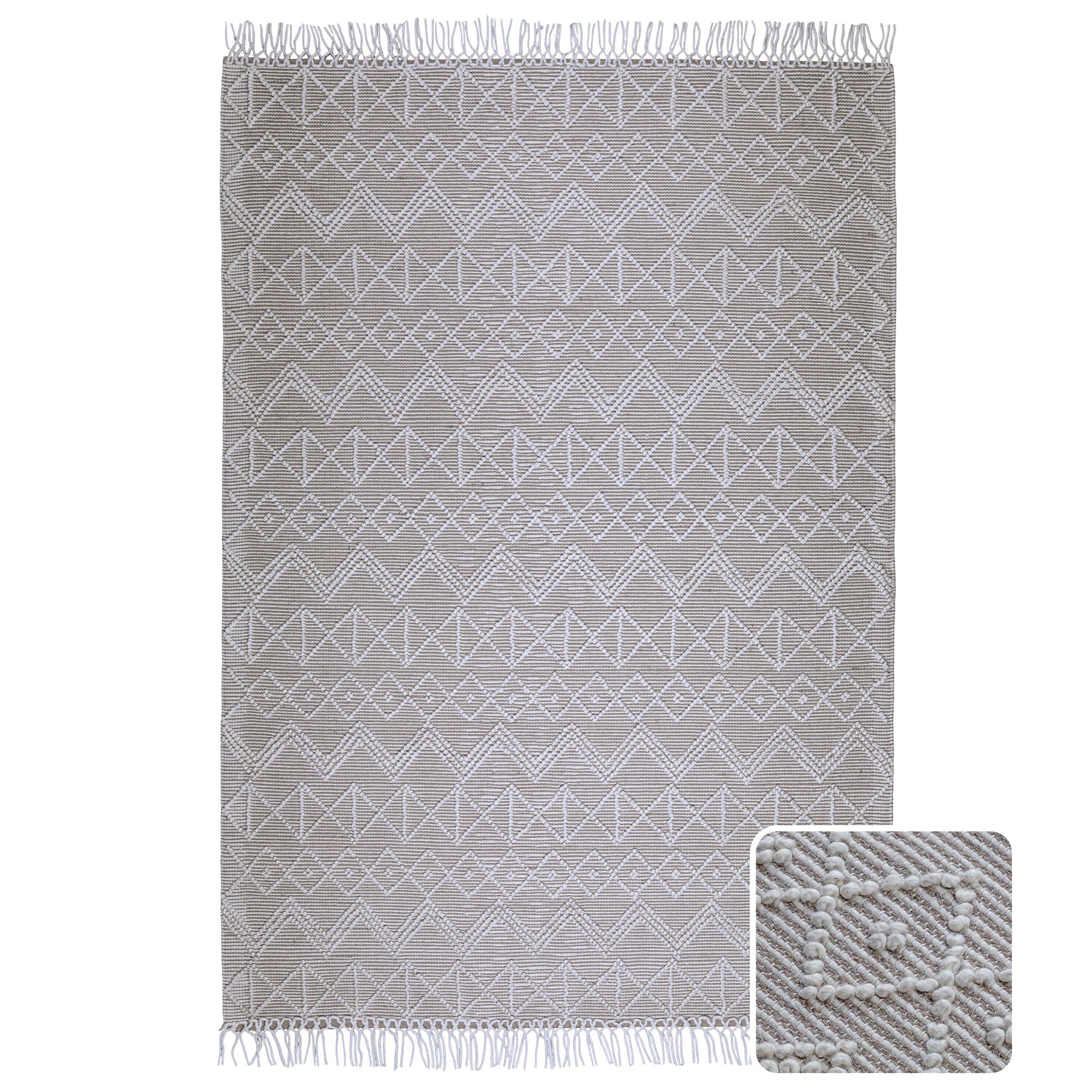 - Detailed with a geometric pattern in ivory and taupe featuring a hand-knotted fringe