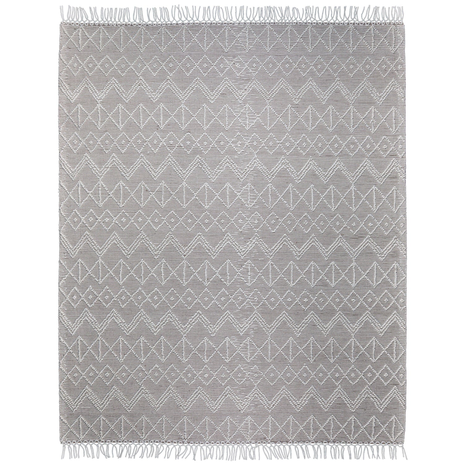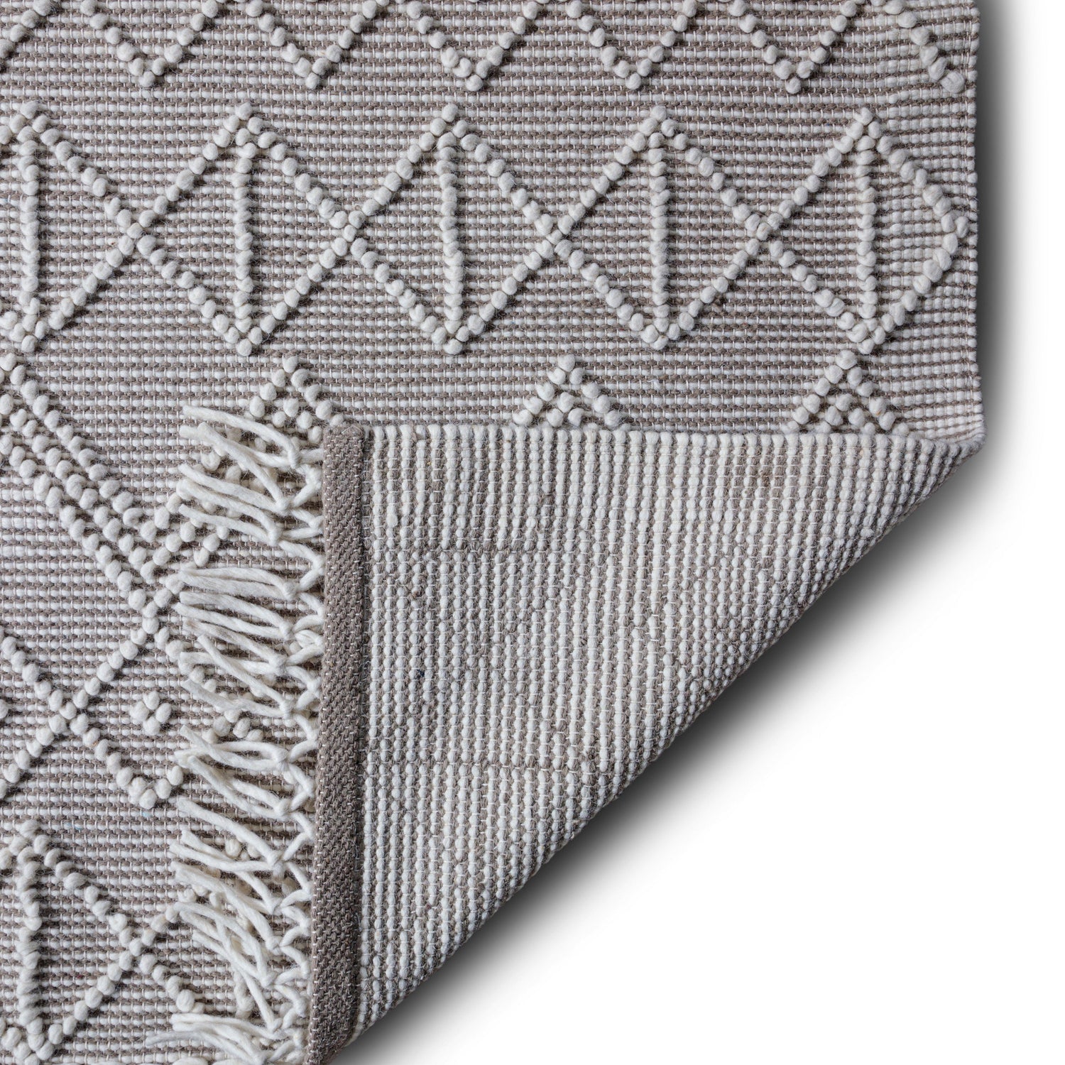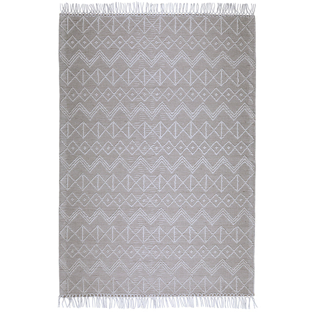 - Detailed with a geometric pattern in ivory and taupe featuring a hand-knotted fringe