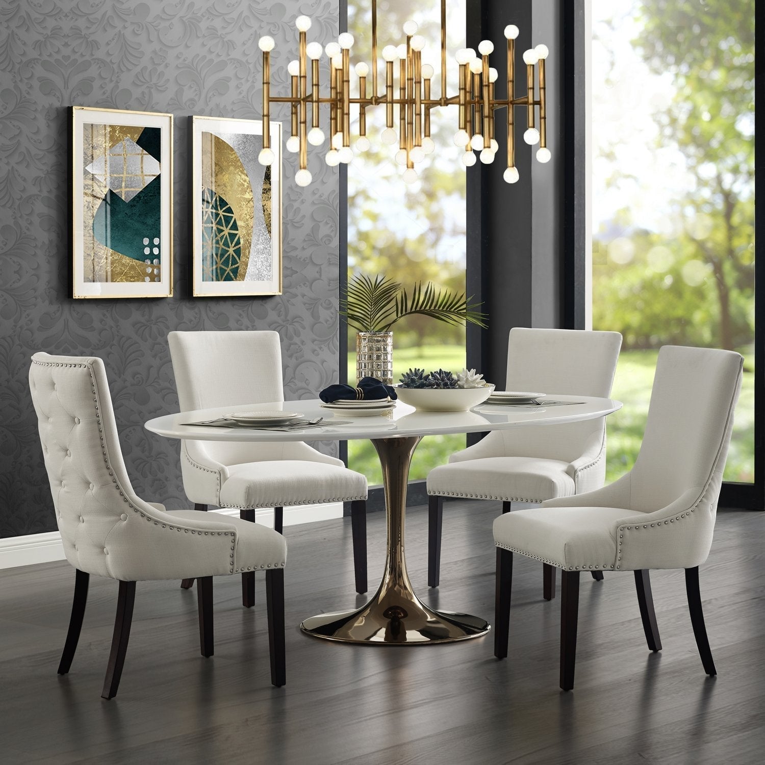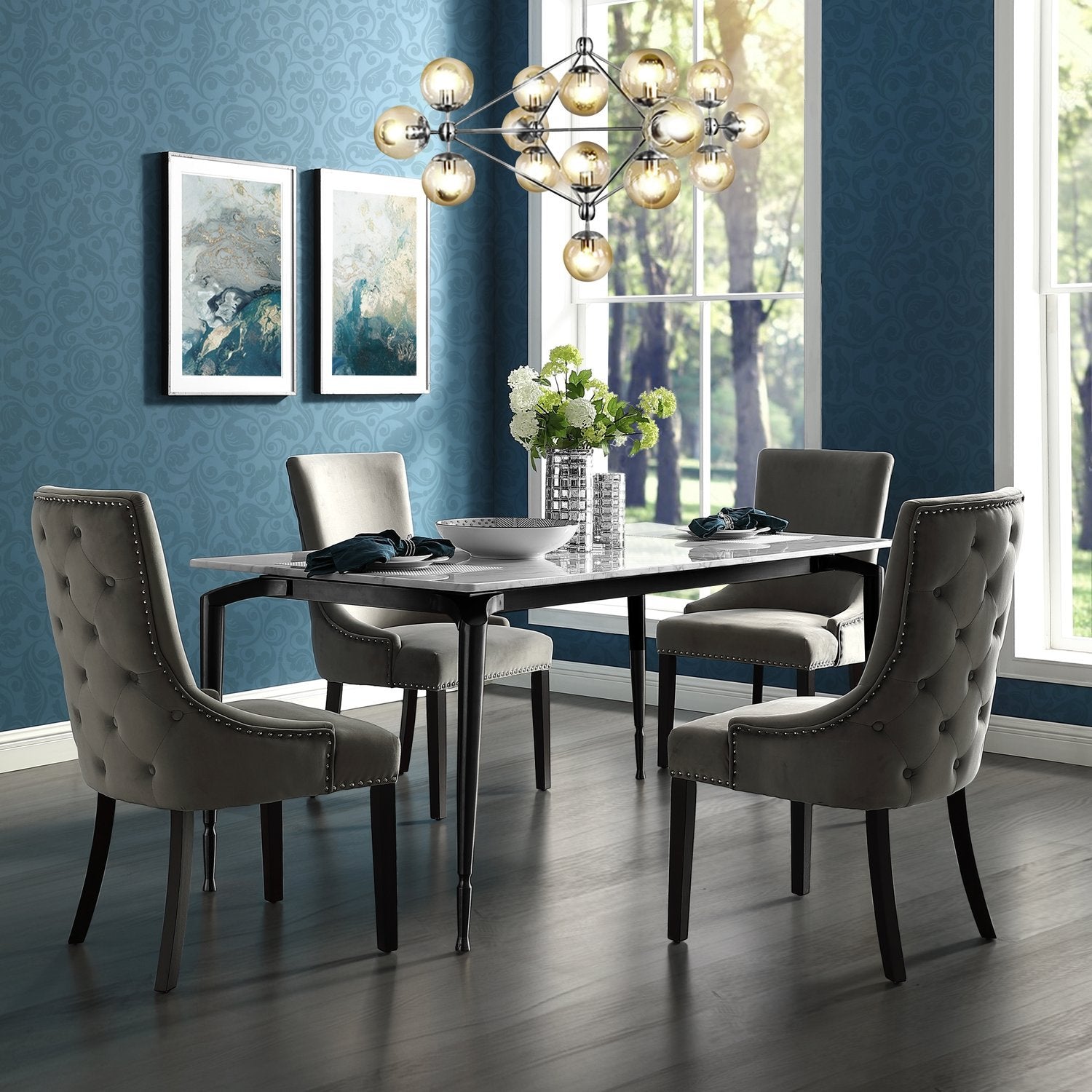 - SET OF 2 - Sold as a set of 2 matching chairs. Pair it with any dining table to add a luxurious and elegant look. Designed to dress up any dining space, this set of two chairs features leather PU, velvet or linen upholstery in a choice of color.