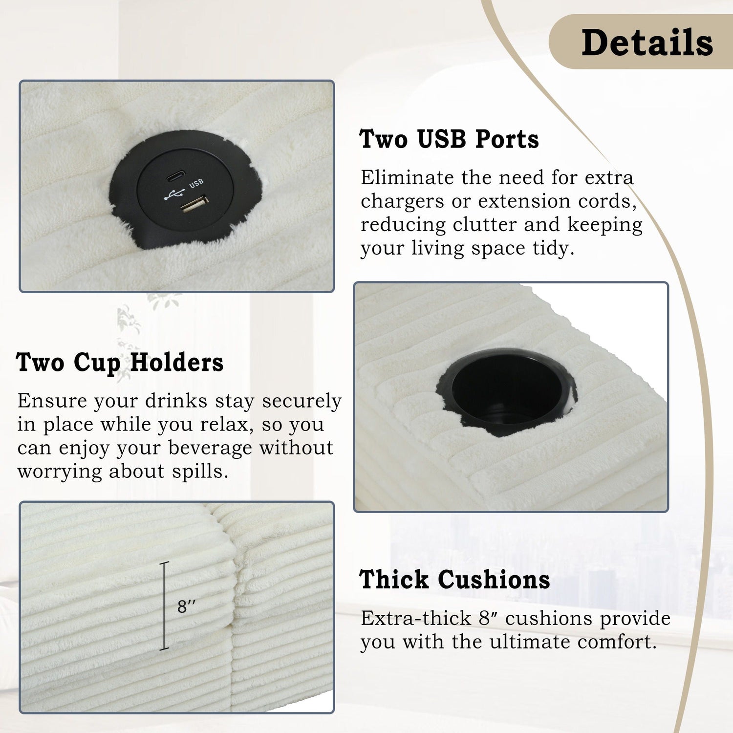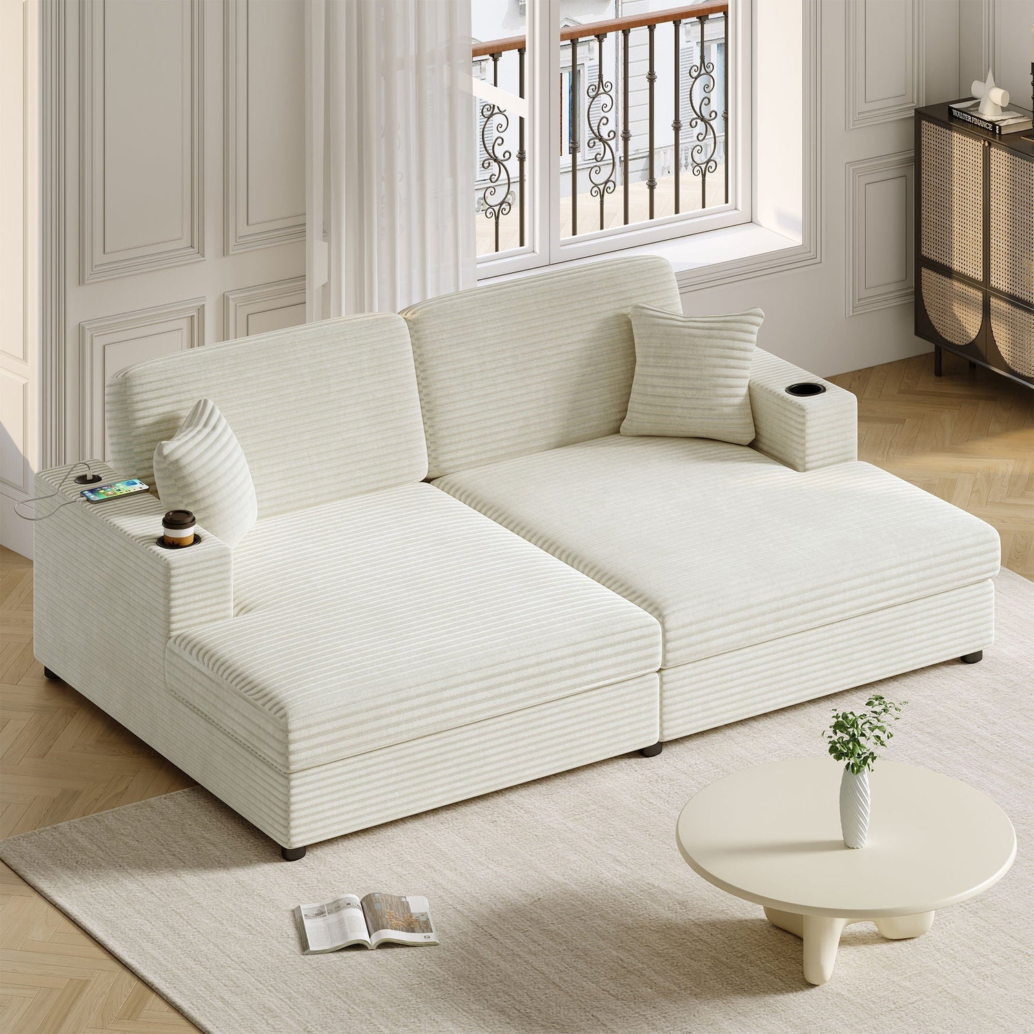Couch.com Oversized Loveseat Chaise Lounge Sectional Sofa Bed Corduroy Sleeper Sofa With 2 USB Ports, 2 Cup Holders And 2 Throw Pillows For Living Room And Bedroom Beige, Fabric Construction