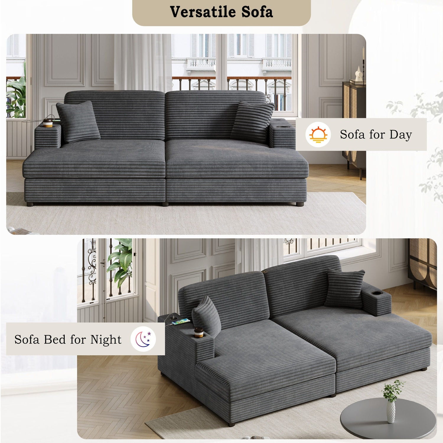 Couch.com Oversized Loveseat Chaise Lounge Sectional Sofa Bed Corduroy Sleeper Sofa With 2 USB Ports, 2 Cup Holders And 2 Throw Pillows For Living Room And Bedroom Dark Gray, Fabric Construction