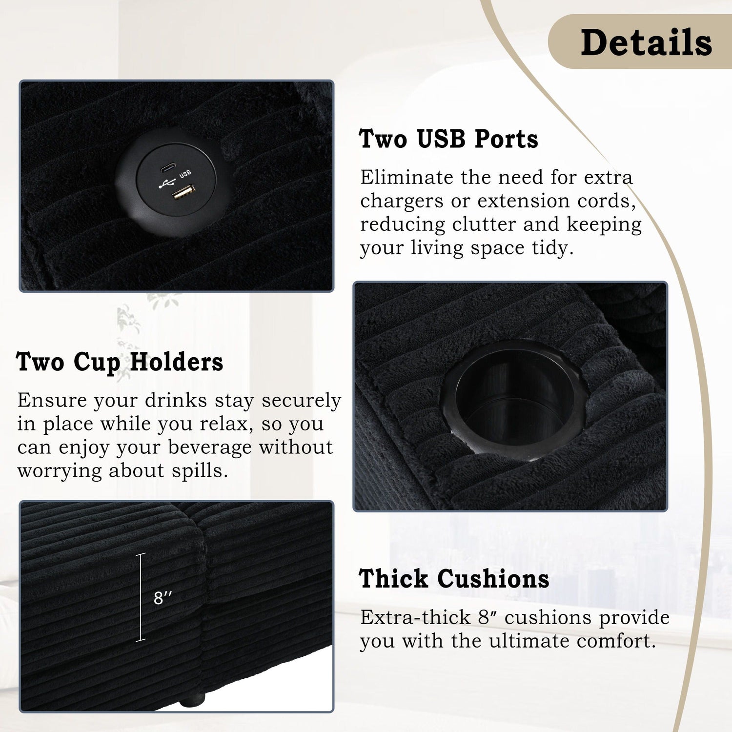 Couch.com Oversized Loveseat Chaise Lounge Sectional Sofa Bed Corduroy Sleeper Sofa With 2 USB Ports, 2 Cup Holders And 2 Throw Pillows For Living Room And Bedroom Black, Fabric Construction