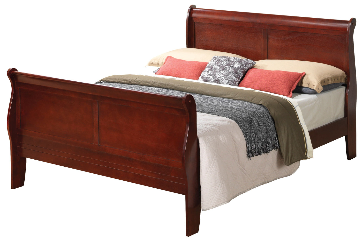 - Panel Sleigh Bed Design: Features a classic and elegant design with wood veneers and trim.
