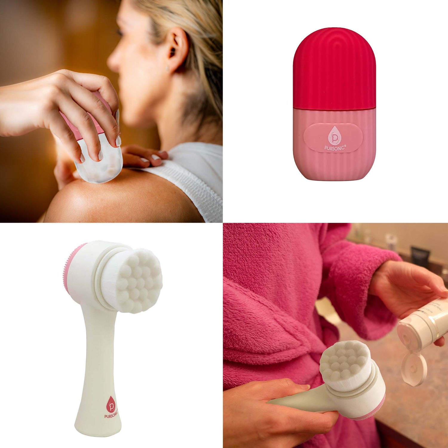 Perfect Skincare Duo: Ice Cube Facial Roller Massager for Face, Eyes, and Neck & Dual Sided Facial Cleansing Brush by Pursonic