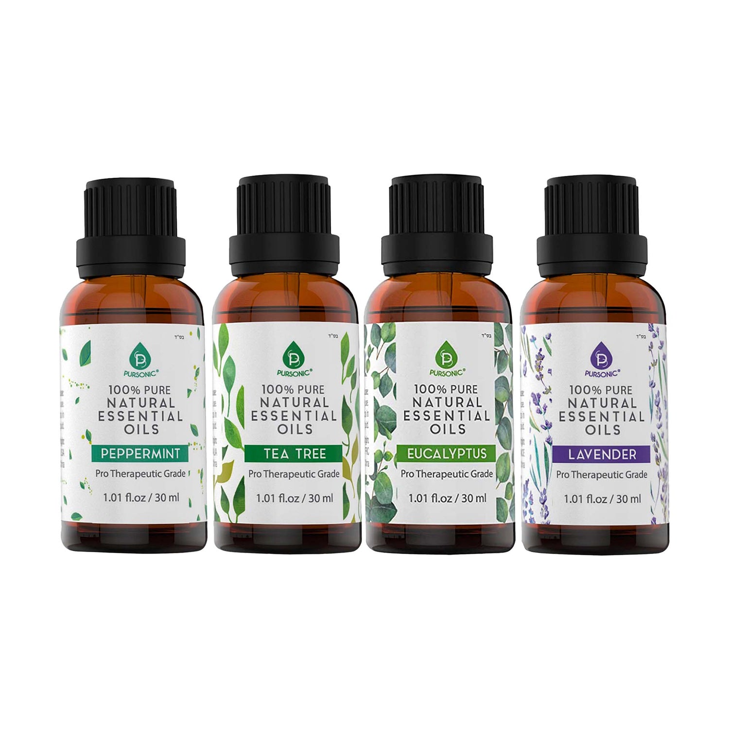Pursonic 4-Pack Pure & Natural Essential Oils Collection – Eucalyptus, Lavender, Tea Tree, and Peppermint by Pursonic