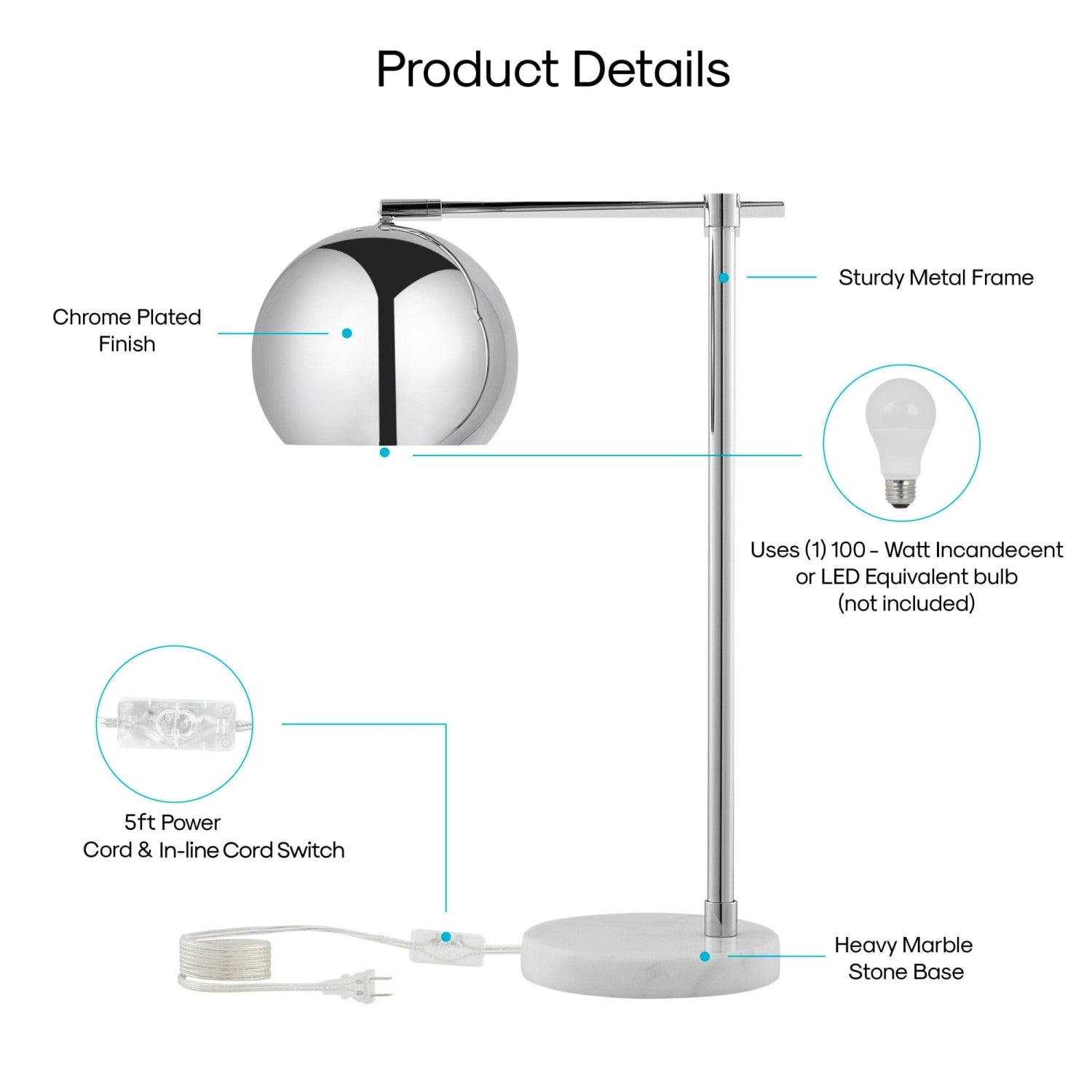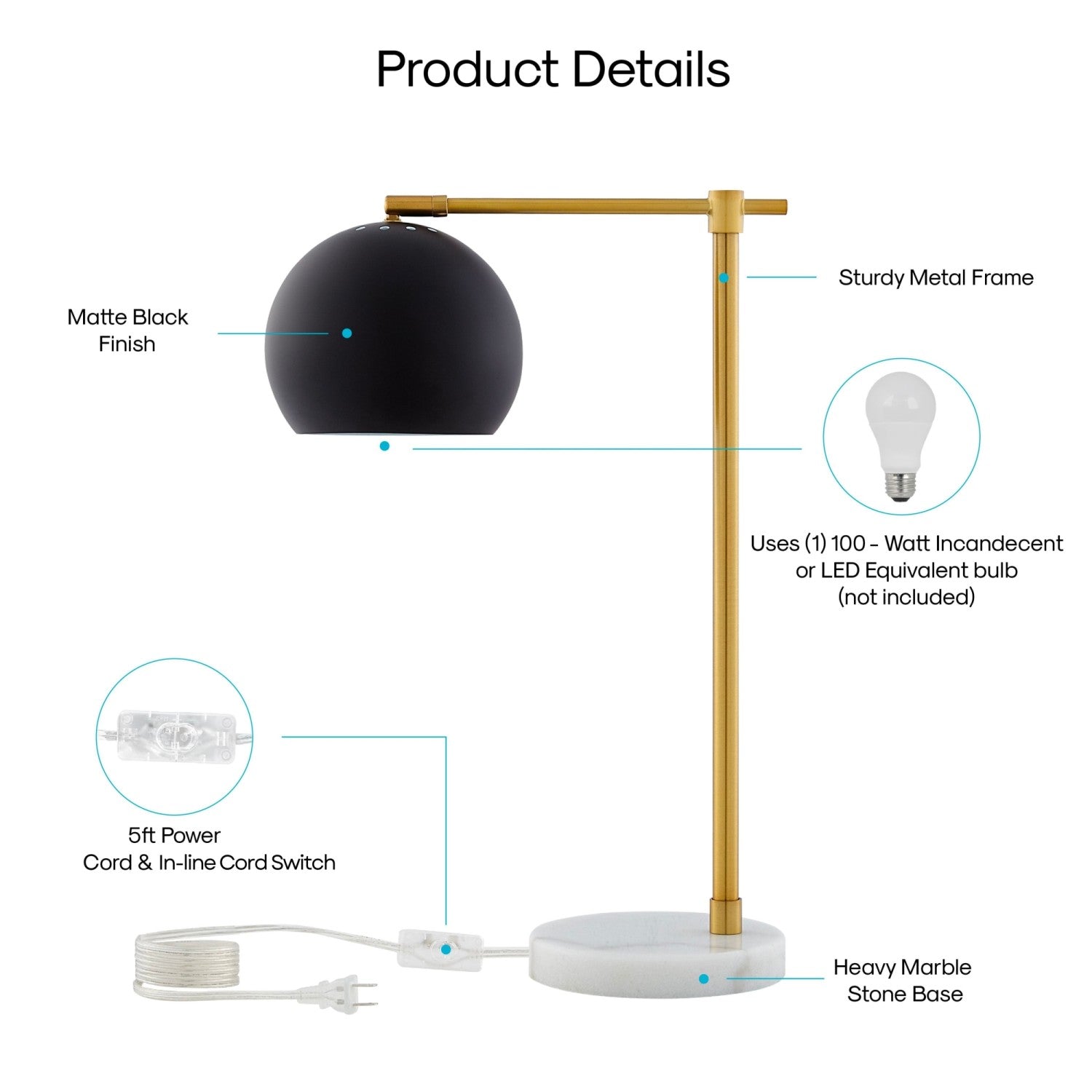 - ATTRIBUTES: 5ft Power Cord, Marble Stone Base, Sturdy Metal Frame, In-line Switch