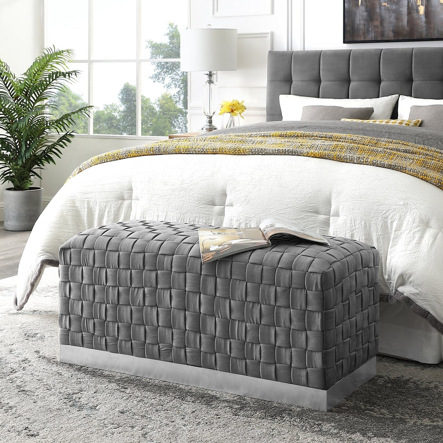 - MODERN DESIGN – Modern and chic velvet upholstered bench with rich tufted intricate woven pattern and stainless steel base in rectangular design provide gentle splendor while entertaining or relaxing. Enhance your room with this beautiful elegant bench and give your home a touch of luxury