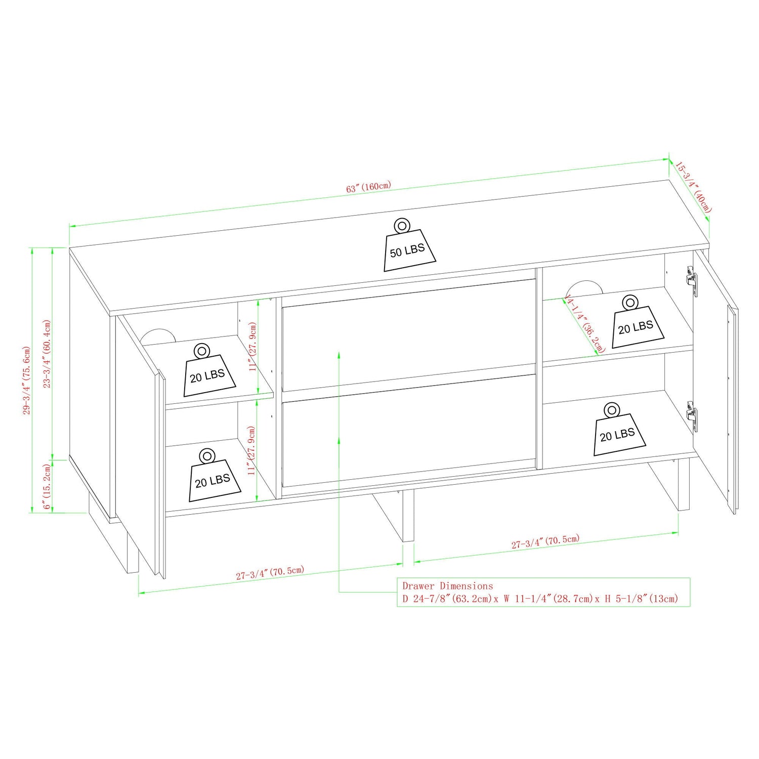63.0"W x 15.75"D x 29.75"H - 118.0 lb