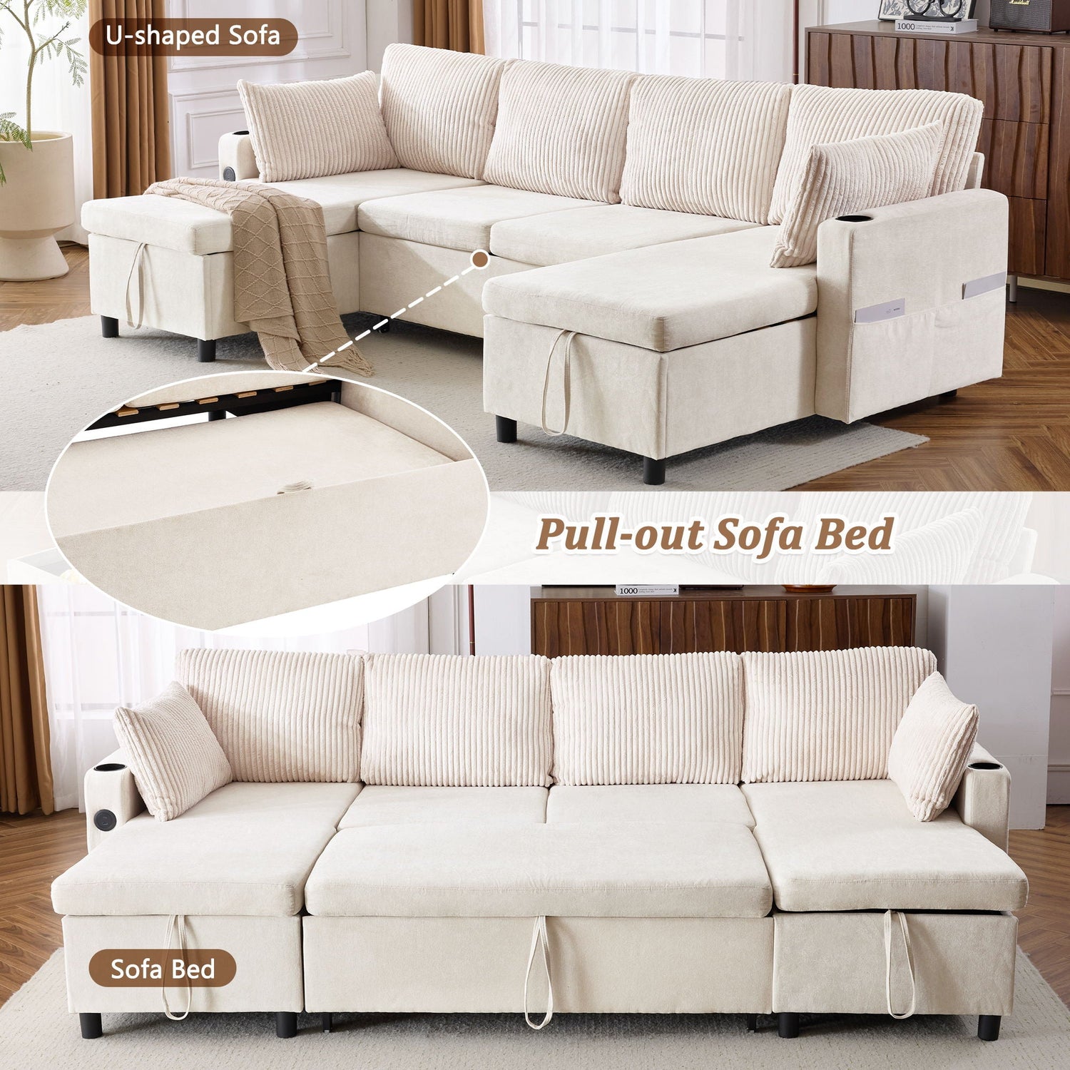 Sectional Sofa Pull Out Sofa Bed Versatile Sofa Sleeper With Large Storage Space, Two USB Ports And Two Cup Holders For Living Room - Beige