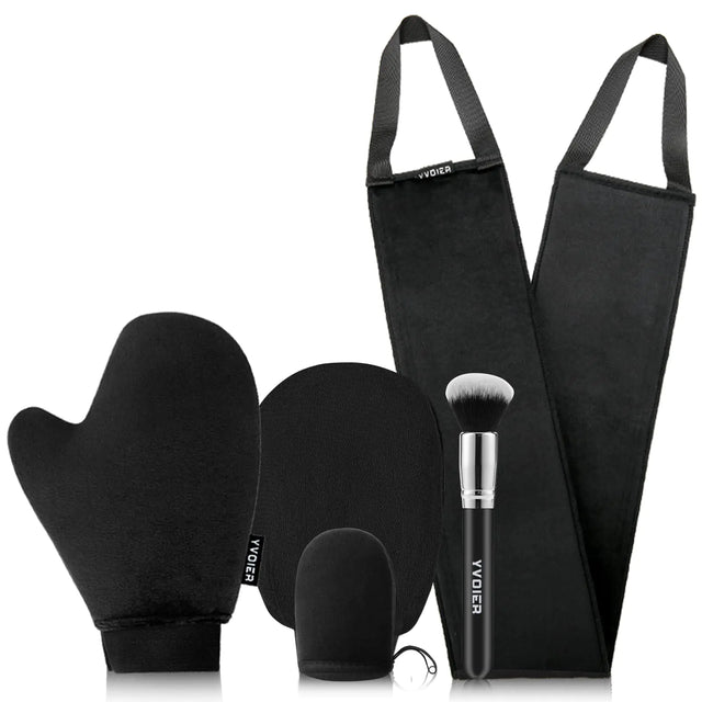 Yvoier Self Tanning Mitt Kit borns for real Self Tanning! Our self tanning mitt applicator kit is included: 1 x Thumb tanning mitt, 1 x Mini tanning glove, 1 x Back Applicator, 1 x Exfoliate Mitt, 1 x Tanning Brush What our self tanner mitt can offer you? 1, Our tanning mitts self tanner kit can ensure you use the suitable tanning mitt according to different needs. The thumb sunless tanner mitt, designed with a thumb hole, have great control, can help you apply the lotions evenly on all your body part . The back applicator can reach to the back area that the hands are hard to reach. The mini tanning glove for self tan and tanning brush are perfect for the detail areas like the face and fingers. The exfoliate mitt performs well in removing dead skin, which can help the tanning product applied absorbed quicker more smoothly. 2, Premium velvet material makes our self tanner glove super soft, and there is an elastic cuff around the wrist, easy to take it on or off, and doesn’t slip off or rotate while using. 3, Good fabric material makes our self tan mit go on really smooth and streak-free while applying. 4, Our self tanner applicator are easy to clean,you can hand wash in warm water, or machine wash and hang dry. Aslo, washing will not lose its softness,durable material allows you to use it again and again. 5, The sunless tanner mitt use for a wide range of applications, it can be used together with other brands of lotion, cream, mousses, oil.