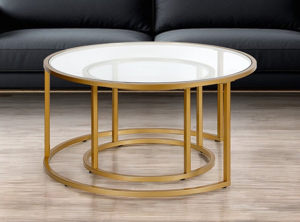 Set of Two 35" Gold Glass And Steel Round Nested Coffee Tables